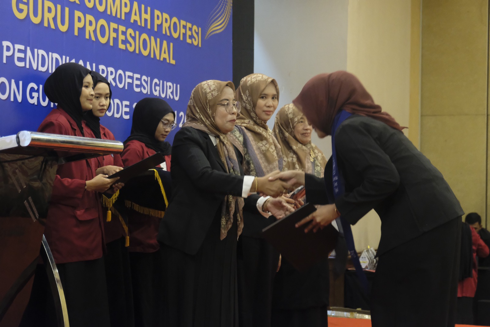 “Kami mengucapkan selamat bagi bapak ibu sekalian. Mulai hari ini bapak ibu berhak menyandang gelar profesi guru profesional,” katanya.