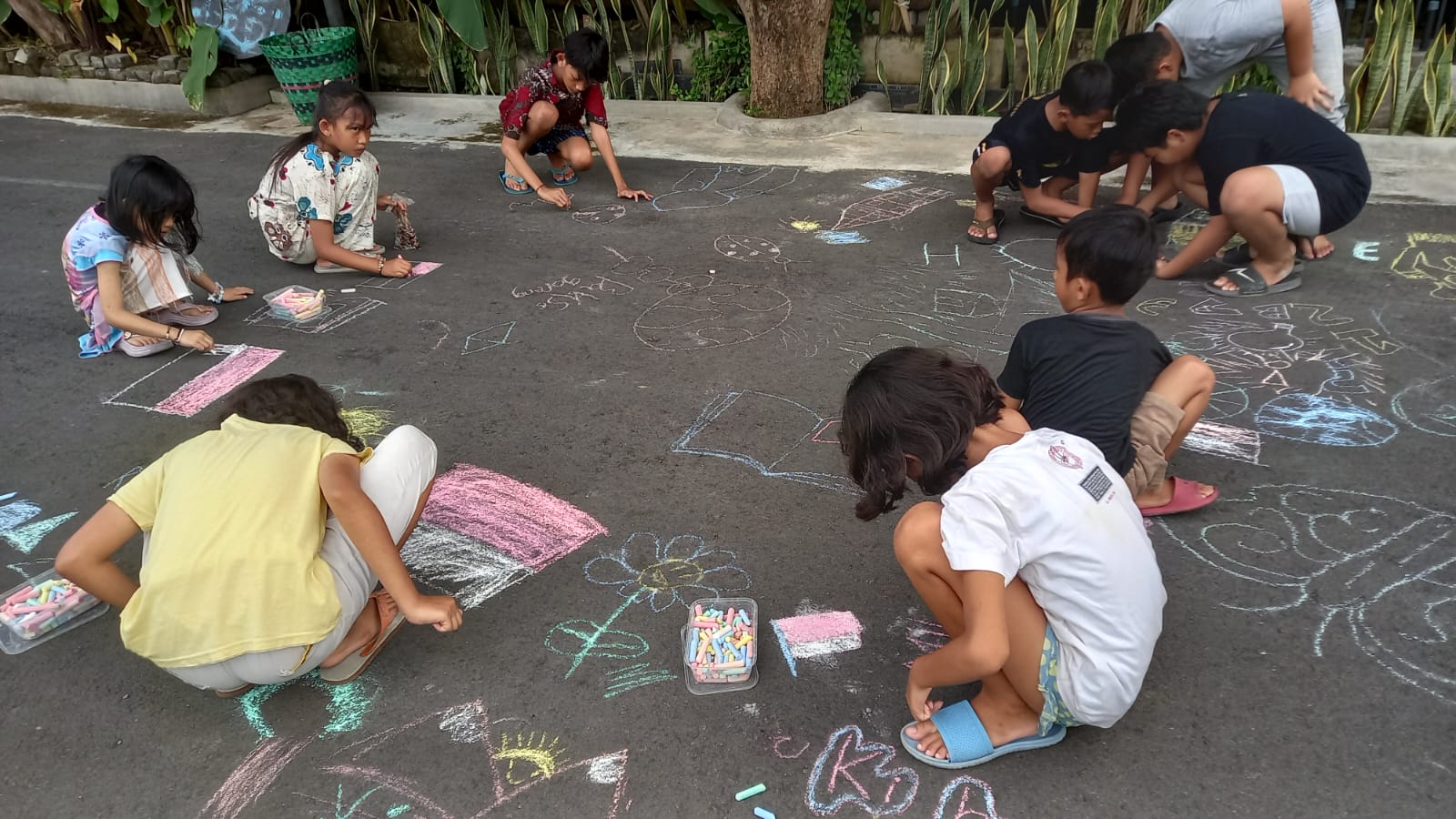 Tampak anak yang setara usia sekolah dasar ini terlihat asyik menggambar beragam obyek di jalan aspal ini.
