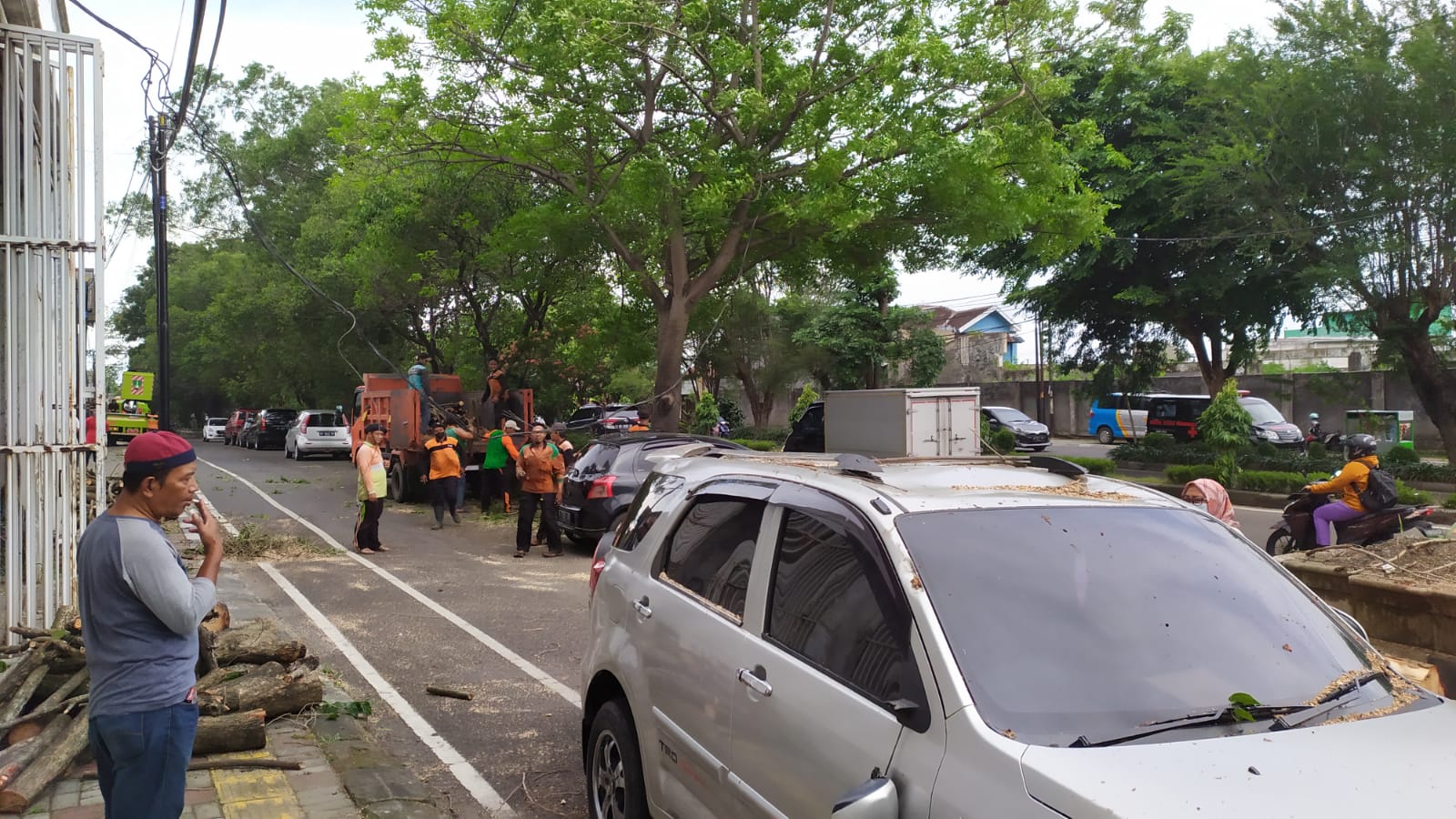 ” Saya tadi mau parkir, belok ke jalan trotoar, pas udah masuk jalan trotoar pohon ambruk dan mobil ngga bisa jalan,” ungkap pemilik mobil yang enggan disebut namanya.