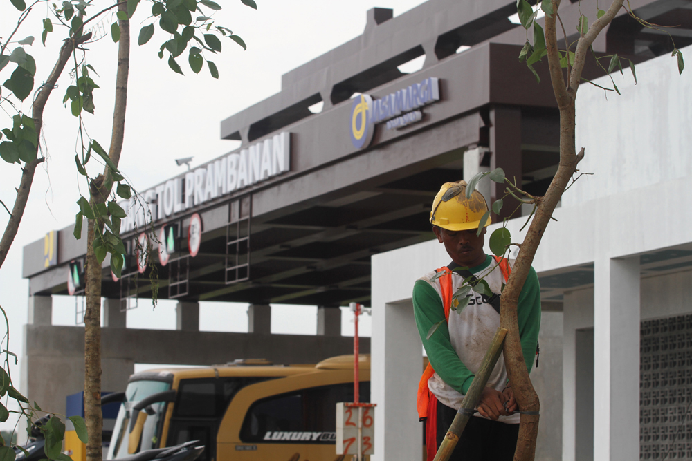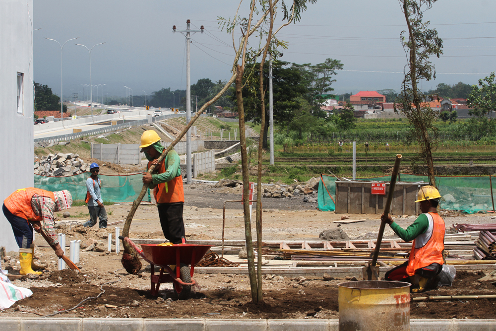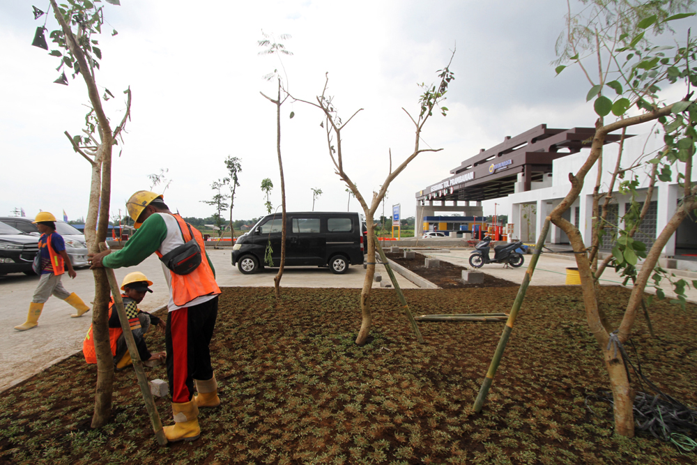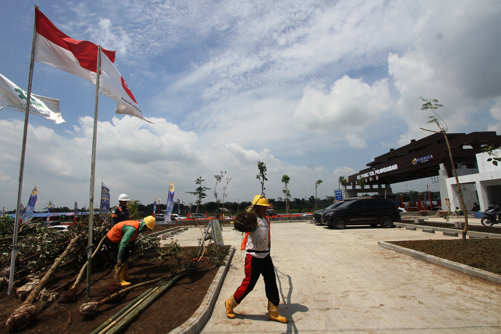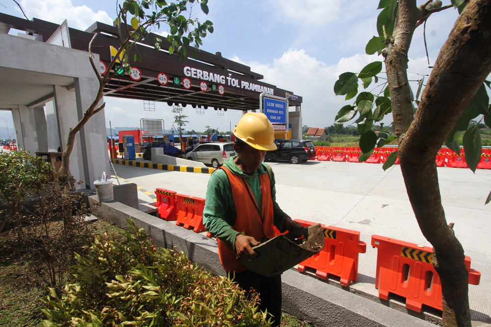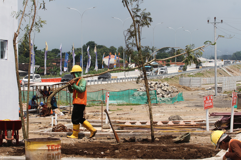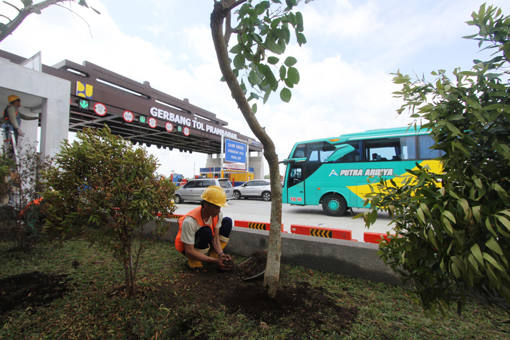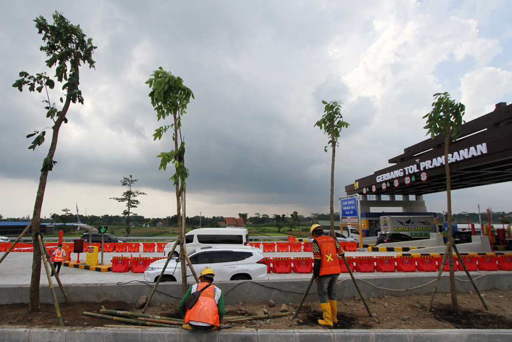 Pekerja menanam pohon disekitar gerbang tol Prambanan, Klaten, Jawa Tengah (23/12/2024). Gerbang tol yang masih digunakan secara gratis dan fungsional tersebut dapat dilalui dari pukul 06.00 hingga 18.00 untuk akses libur Natal dan tahun Baru. Ratusan pohon terdiri dari Mahoni, Dadap, Cempaka, Sawo Kecil, dan pohon Salam ditanam untuk mencegah hawa panas disekitar pintu tol tersebut.
