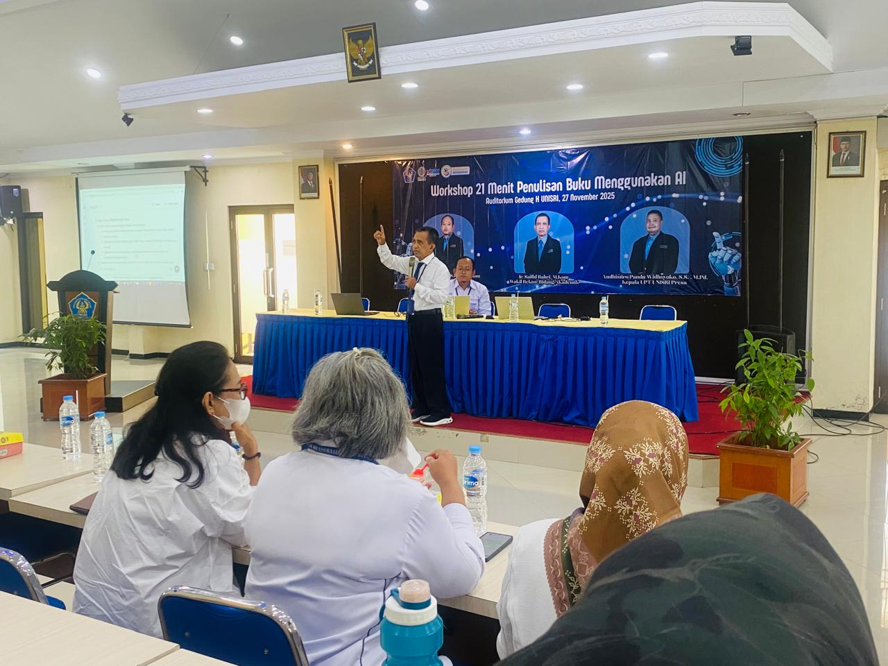 Workshop tersebut menghadirkan tiga narasumber internal Unisri, yaitu Saiful Bahri, Menawar Kholil, dan Yudhistiro Pandu Widhiyoko, yang memberikan materi terkait teknik penulisan buku dengan memanfaatkan teknologi kecerdasan buatan (AI).
