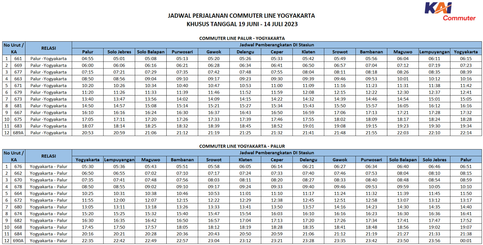 VP Corporate Secretary KAI Commuter Anne Purba menjelaskan, mulai Senin (19/6/2023), KAI Commuter akan mengoperasikan setiap hari nya sebanyak 12 jadwal perjalanan KRL. Dari Palur – Yogyakarta mulai pukul 04.55 -20.53 WIB. Dan 12 perjalanan Commuter Line dari Yogyakarta – Palur mulai pukul 05.30 – 22.35 WIB.