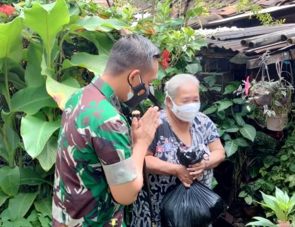 Didampingi Danramil 04/Jebres Kapten Cba Tri Rusman Prasetyo, bersama Babinsa Kelurahan Jebres Sertu Suparno bantuan itu diserahkan secara door to door.