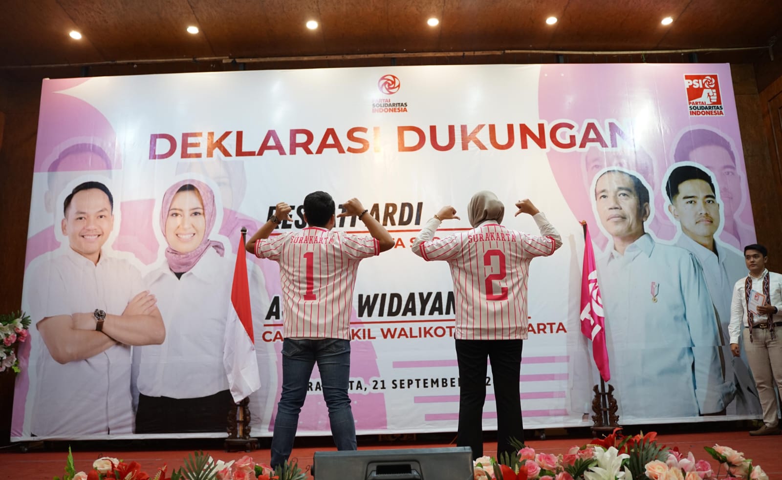 Usai pembacaan Deklarasi Dukungan Respati-Astrid sebagai simbol, bentuk dukungan, PSI Solo menyerahkan kaos softball warna putih dengan motif garis-garis warna pink bertuliskan Surakarta 1 dan Surakarta 2 di bagian punggung. Sedangkan dibagian depan bertuliskan Pasti.