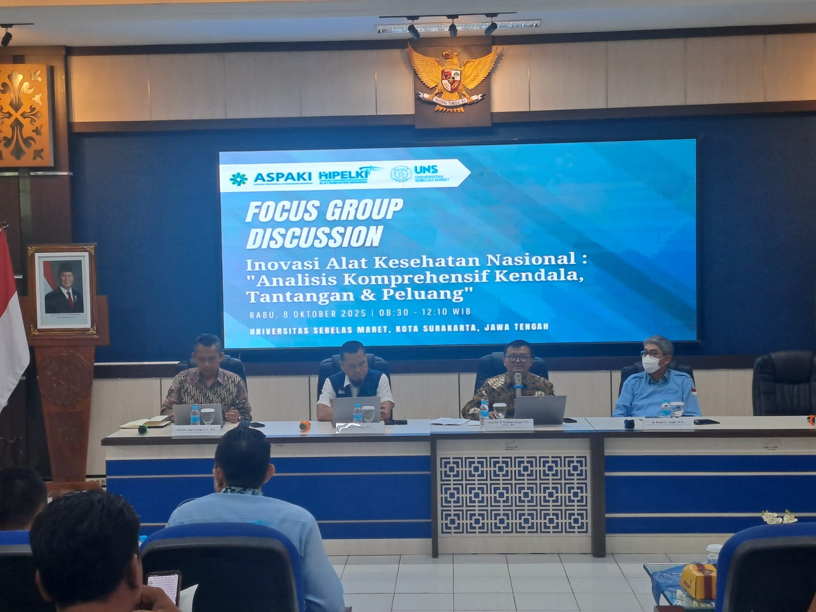 SOLO, MettaNEWS – Fakultas Teknik Universitas Sebelas Maret (FT UNS) memperkuat peran strategisnya dalam mendukung kemandirian industri alat kesehatan nasional melalui penyelenggaraan Focus Group Discussion (FGD) bertajuk “Inovasi Alat Kesehatan Nasional”. Kegiatan ini digelar di Ruang Multi Media, Gedung IV FT UNS, bekerja sama dengan Himpunan Pengembangan Ekosistem Alkes Indonesia (HIPELKI) dan Asosiasi Produsen Alat Kesehatan Indonesia (ASPAKI).