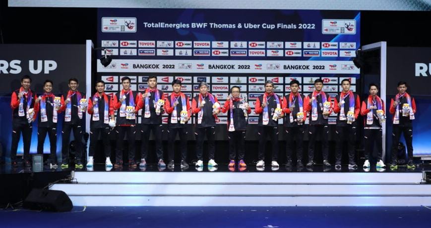 Foto bersama semua jajaran pengurus, pelatih dan atlet bulutangkis Indonesia di Impact Arena, Bangkok usai menjadi runner up di Piala Thomas 2022 | Doc: PBSI