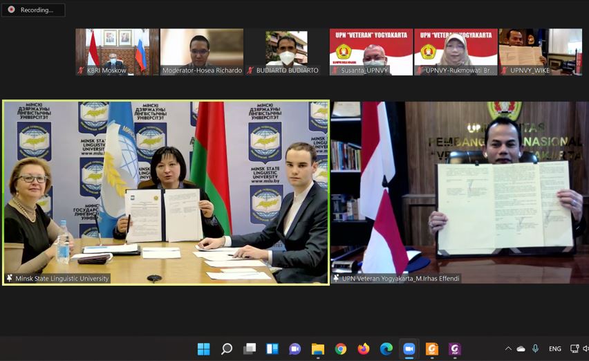 YOGYAKARTA, MettaNEWS – Fakultas Ilmu Sosial dan Ilmu Politik (FISIP) Universitas Pembangunan Nasional “Veteran” Yogyakarta (UPNVY) menandatangani kerja sama dengan Minsk State Linguistic University (MSLU) Belarus, Jumat (14/1/2022) malam. Kerja sama yang difasilitasi Kedutaan Besar RI untuk Federasi Rusia dan Republik Belarus ini fokus pada pertukaran budaya dan bahasa.