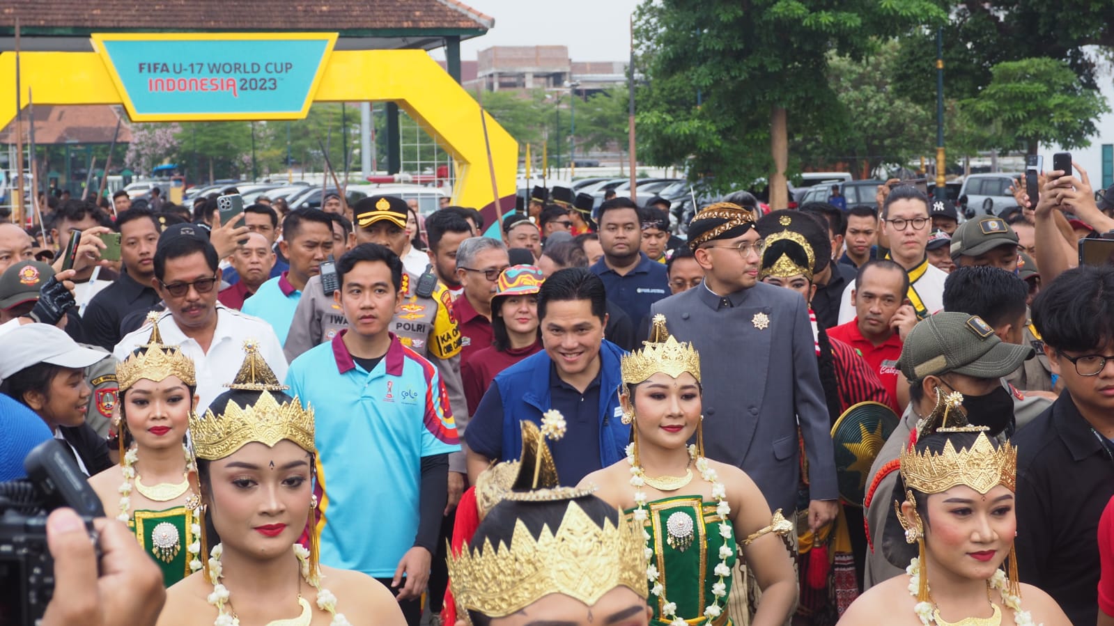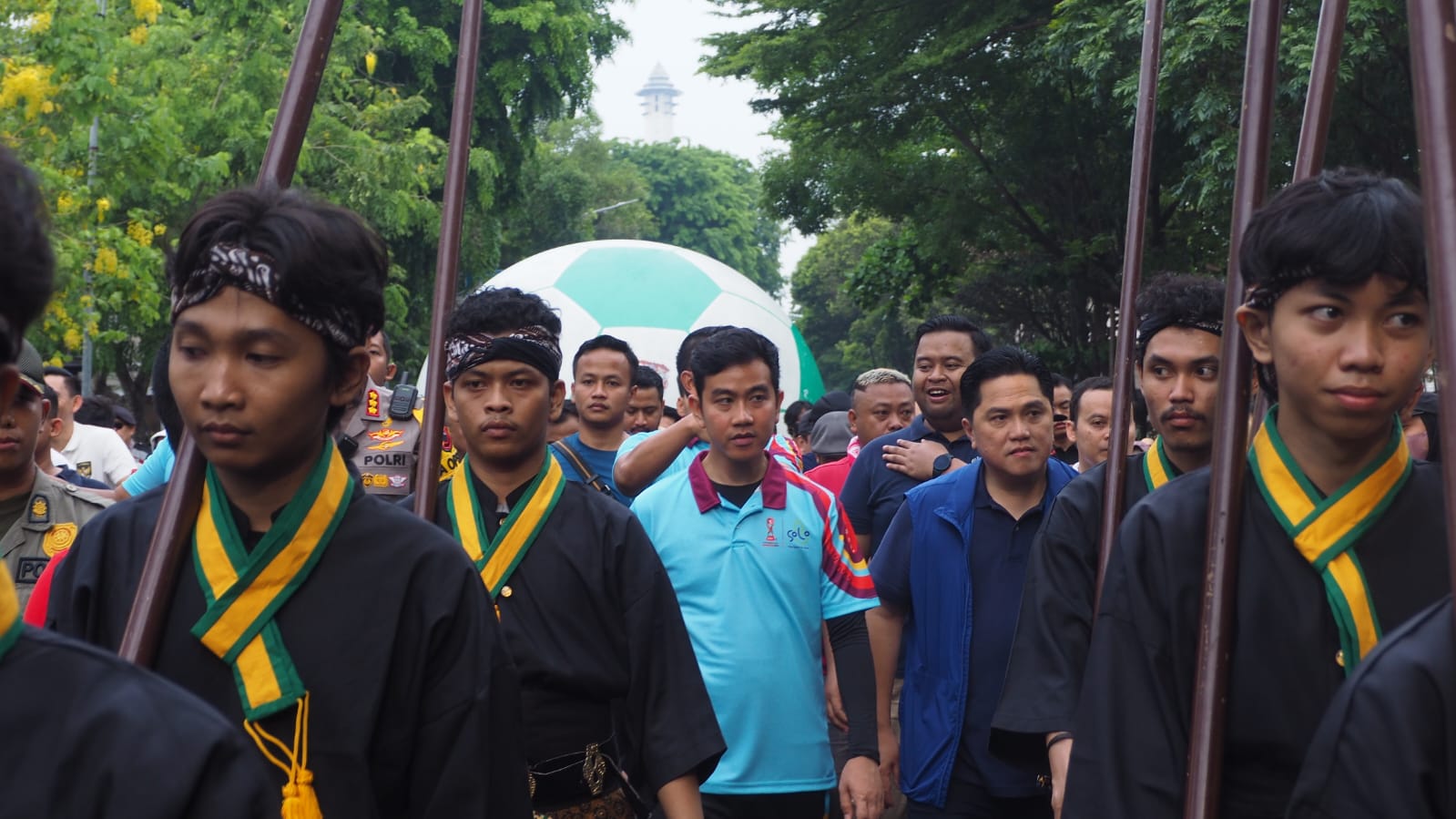 Ketum PSSI Erick Thohir dan Wali Kota Solo Gibran Rakabuming Raka di antara barisan prajurit Pura Mangkunegaran saat kirab trofi tur Piala Dunia U-17 di Solo, Minggu (5/11/2023) | Magang UNS / Kahfi Harahap