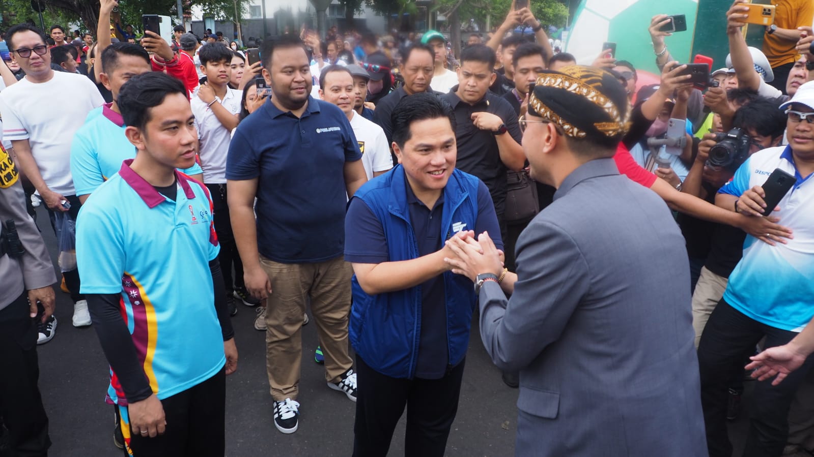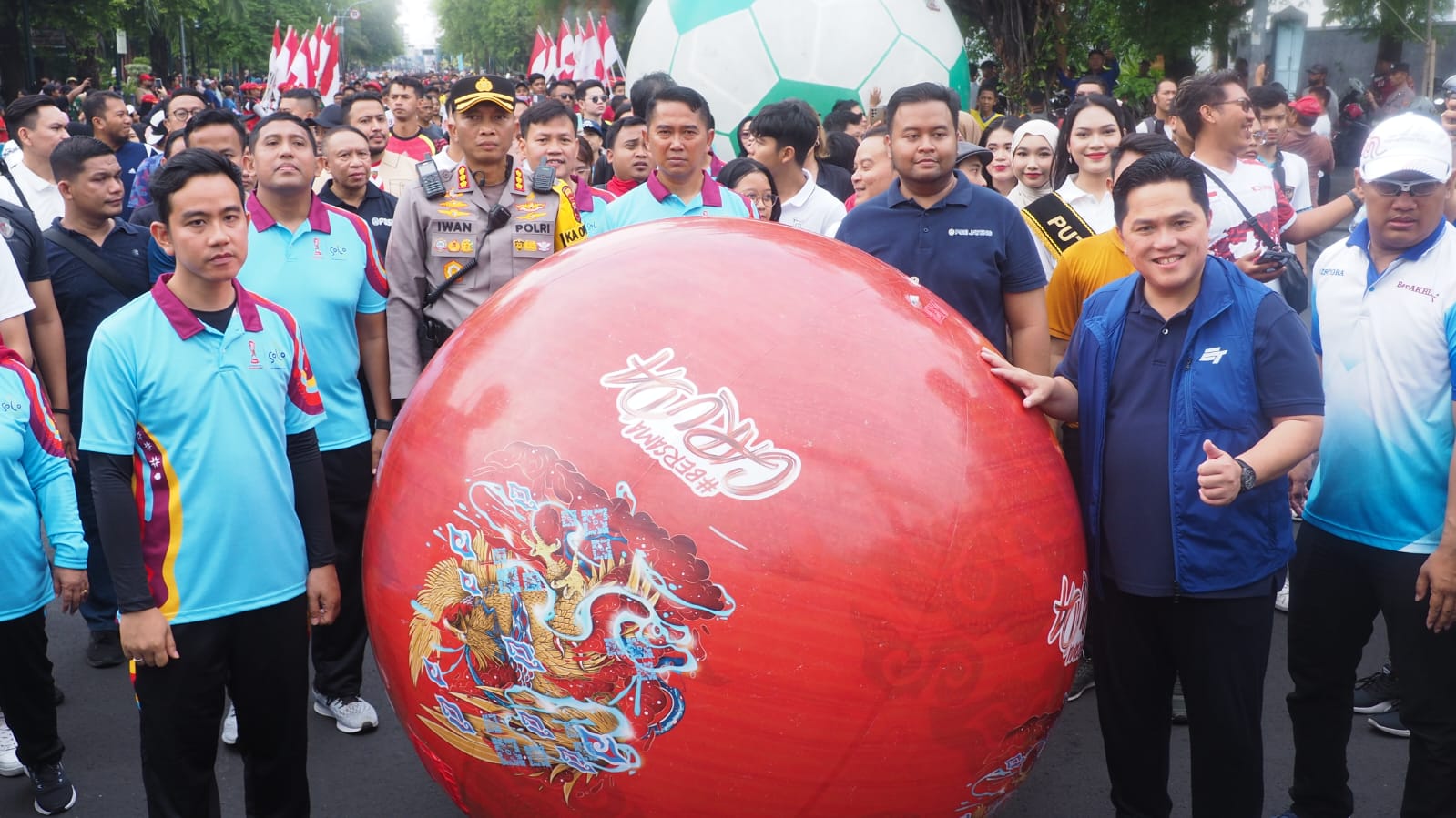 Ketum PSSI Erick Thohir dan Wali Kota Solo, Gibran Rakabuming Raka ikut kirab bola raksasa saat trophy experience Piala Dunia U-17 dari Stadion Sriwedari sampai Pamedan Pura Mangkunegaran, Minggu (5/11/2023) | Magang UNS / Kahfi Harahap