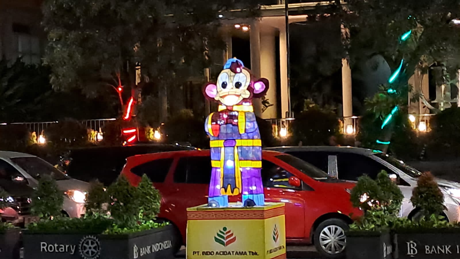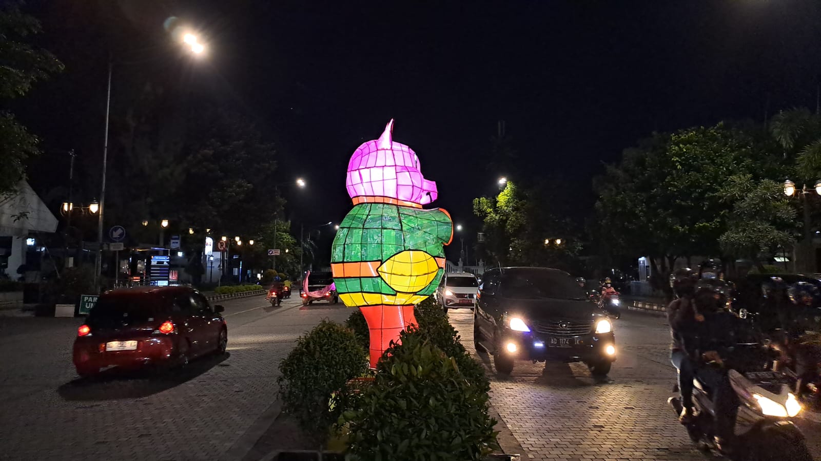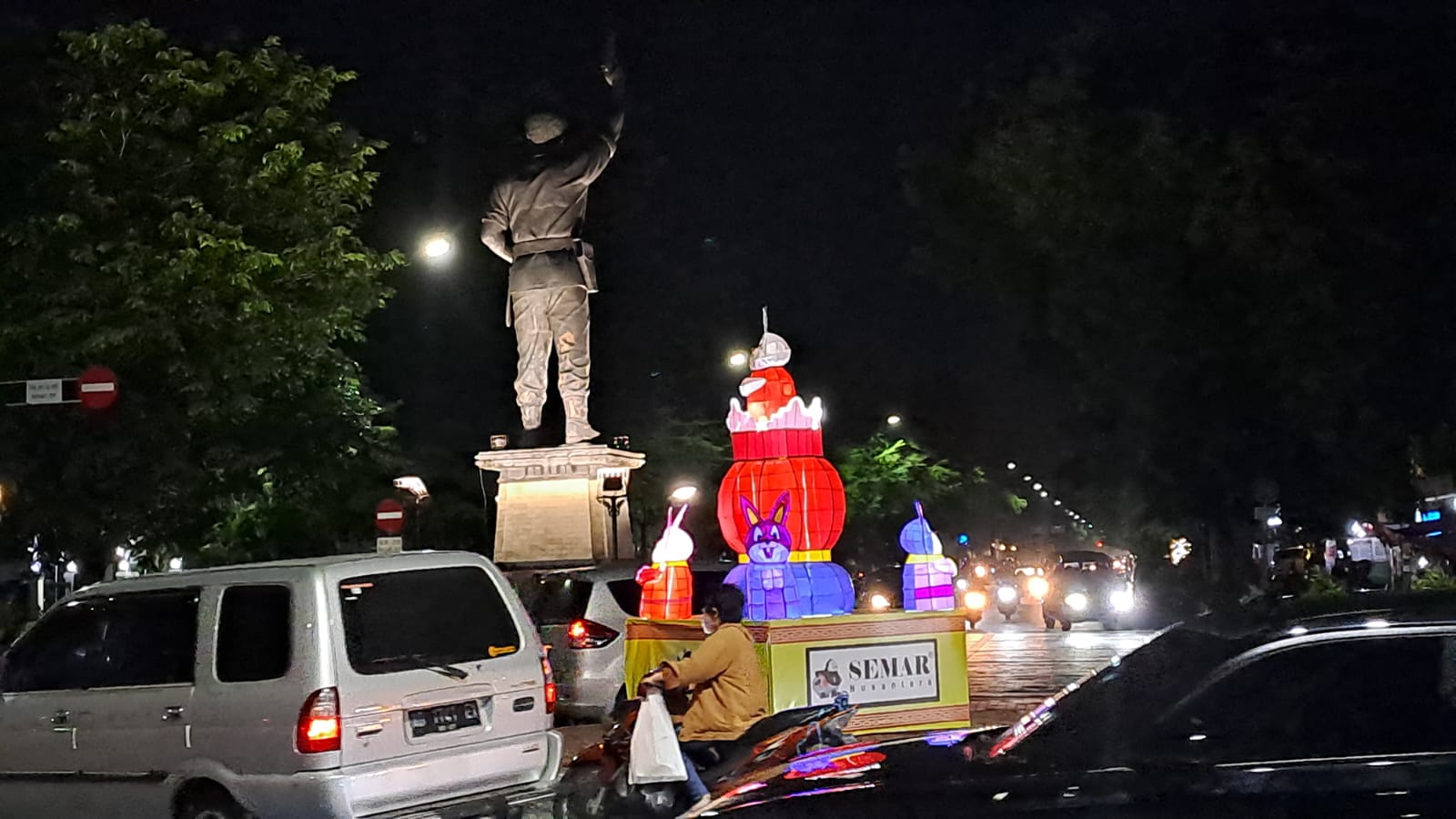 Lampion Master Kelinci berputar menyala di Bundaran Gladag bersanding dengan Patung Monumen Patung Slamet Riyadi di Solo, Sabtu (7/1/2023)