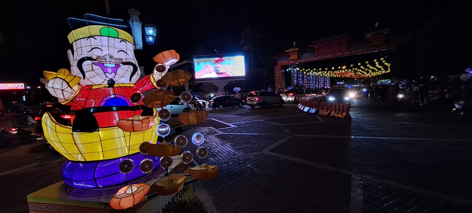 Lampion Dewa Uang menyala di bundaran Jalan Jenderal Sudirman Solo tampak pula gapura Imlek 2023/2574 dari kejauhan, Sabtu (7/1/2023)