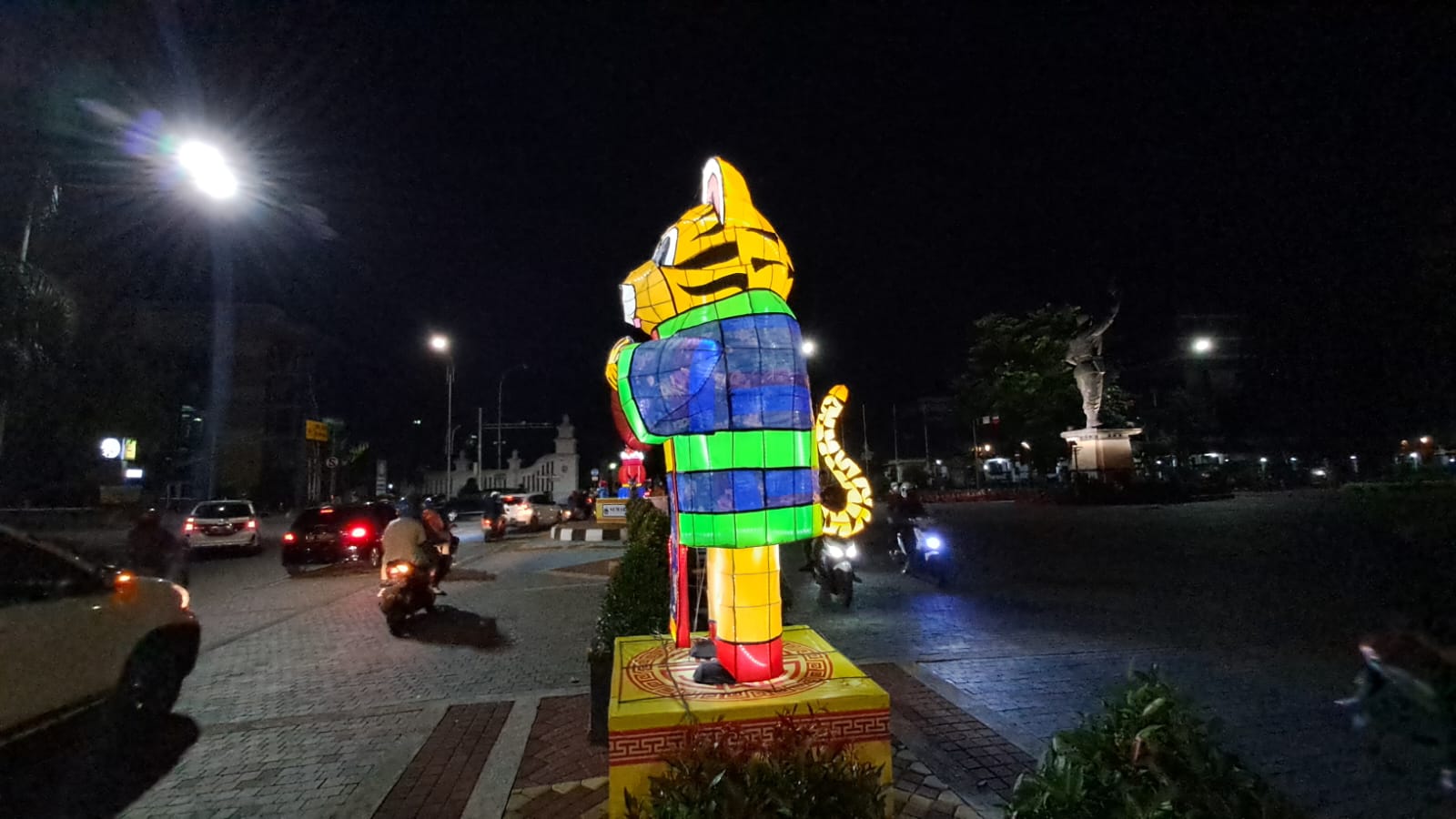 Lampion Shio Macan tampak dari samping berdiri di Jalan Jenderal Sudirman Solo menyala, Sabtu (7/1/2023)