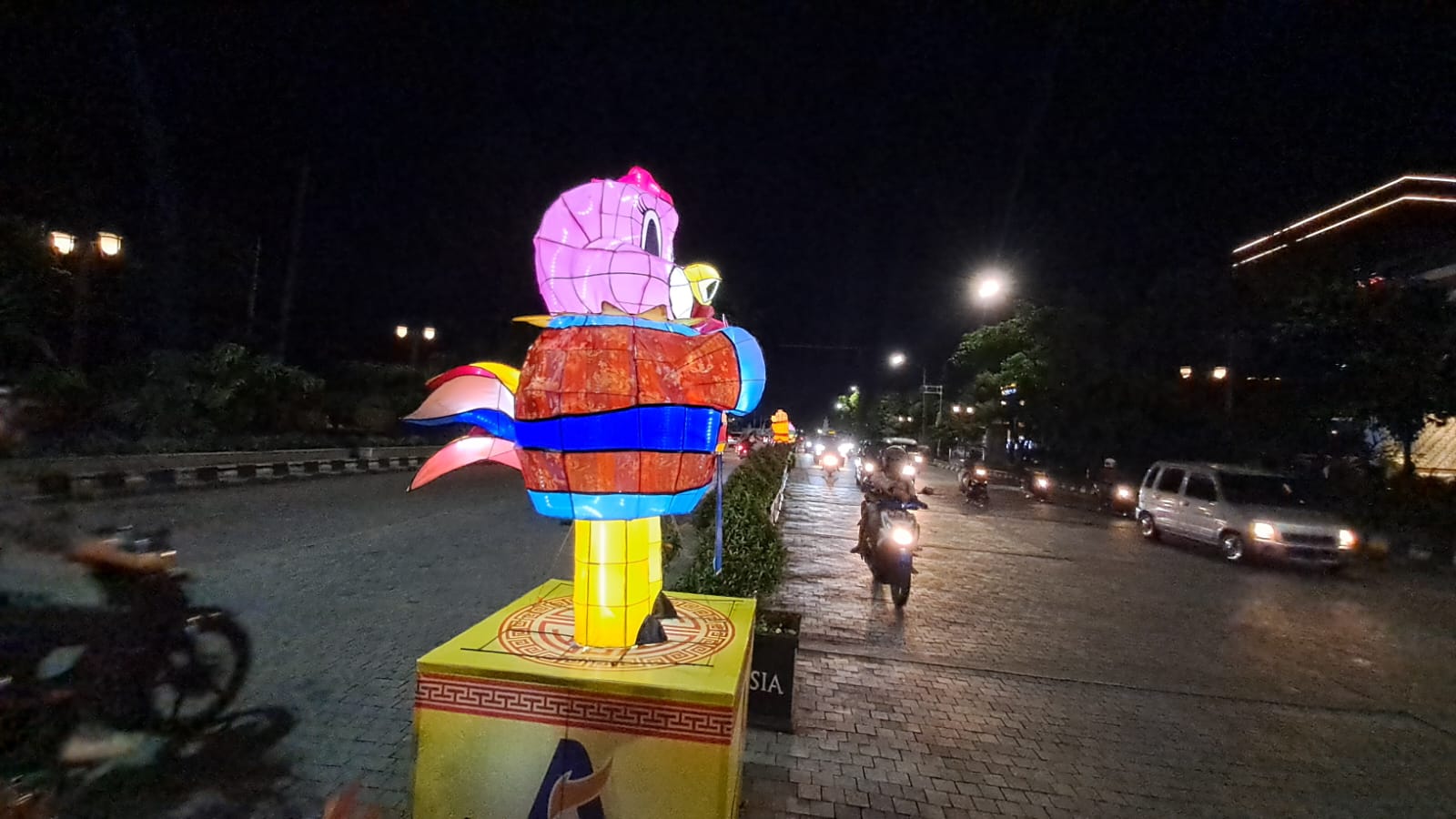 Lampion Shio Ayam di antara lalu lalang kendaraan di Jalan Jenderal Sudirman Solo menyala saat malam hari, Sabtu (7/1/2023)
