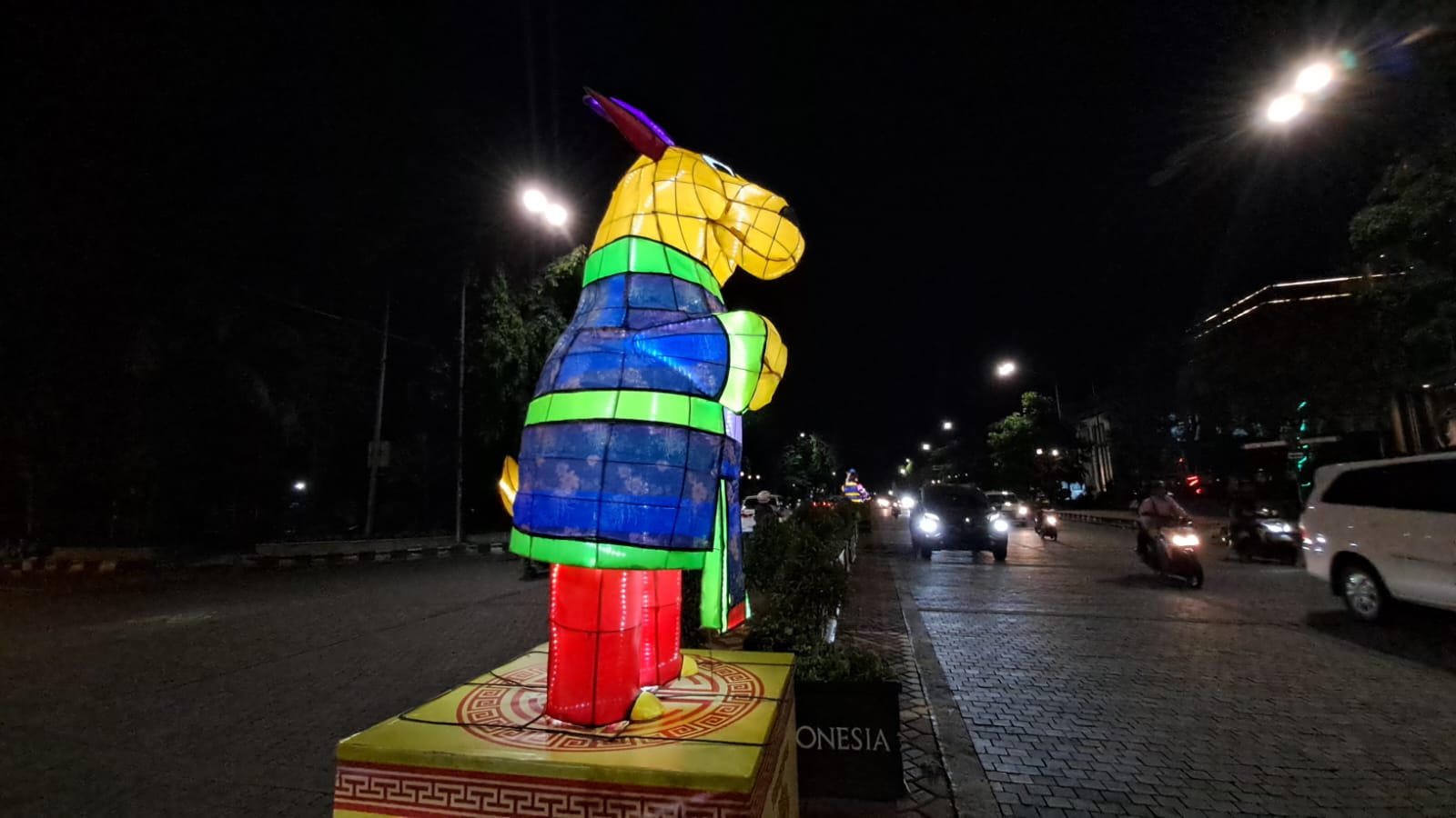 Lampion Shio Anjing di antara lalu lalang kendaraan di Jalan Jenderal Sudirman Solo menyala saat malam hari, Sabtu (7/1/2023)