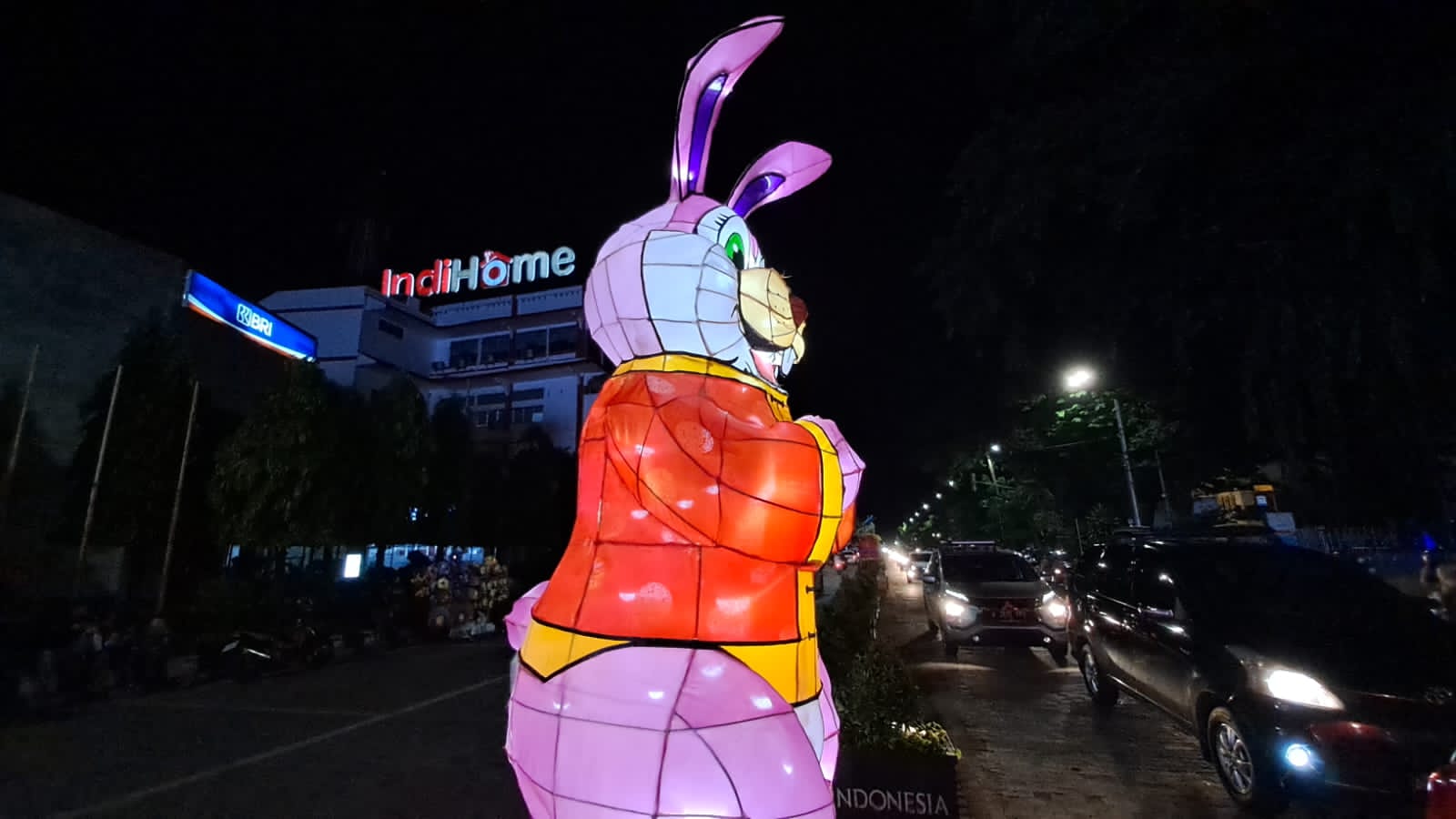 Lampion Shio Kelinci di Jalan Jenderal Sudirman Solo menyala saat malam hari dengan latar belakang gedung, Sabtu (7/1/2023)