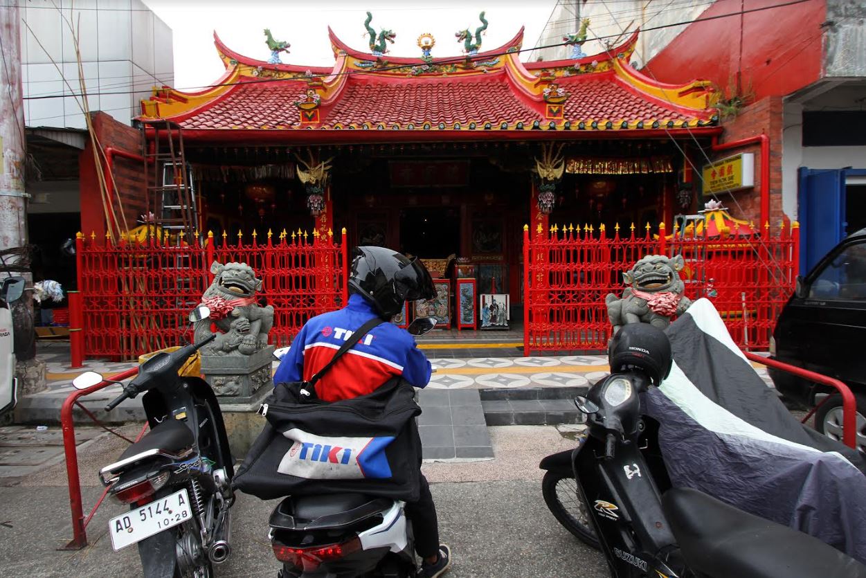 Roy Raka (31) kurir Pick Up Tiki saat proses pengambilan barang pelanggan sesuai aplikasi Sprinter yang dimiliki oleh Tiki di Klenteng Tien Kok Sie Pasar Gede, Solo, Jawa Tengah, Senin (8/1/2024). | Bram Selo Agung