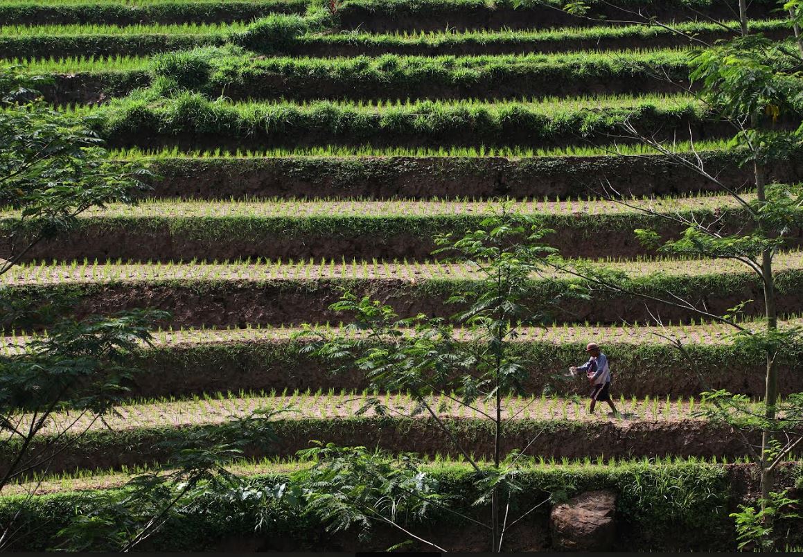 Petani lanjut usia mbah Marso (74), menaburi tanaman padinya yang berumur 10 hari dengan Pupuk Indonesia jenis Urea di desa Palang, kelurahan Pablengan, kecamatan Matesih, Karanganyar, Jawa Tengah, Senin (14/11/2022). Mbah Marso menanam padi dan dibeberapa petak sawahnya untuk dikonsumsi sendiri dengan keluarganya. Mbah Marso akan memanen padinya sekitar tiga bulan ke depan. | Foto Bram Selo Agung Mardika