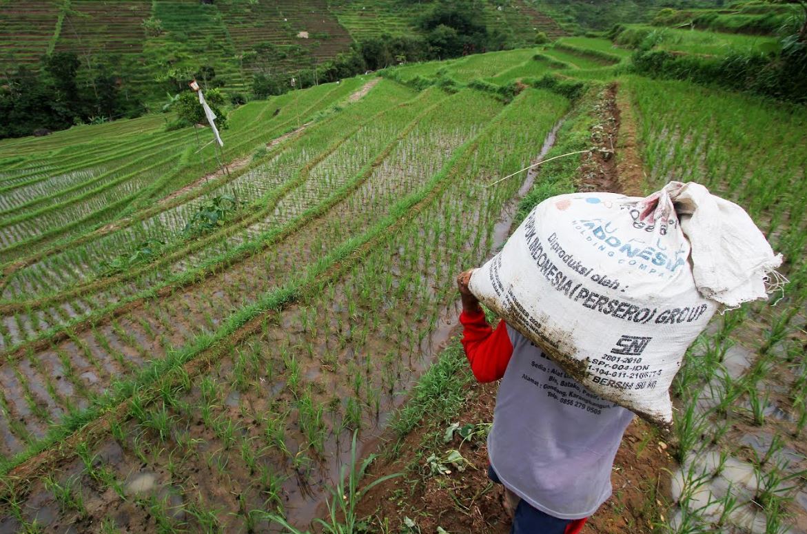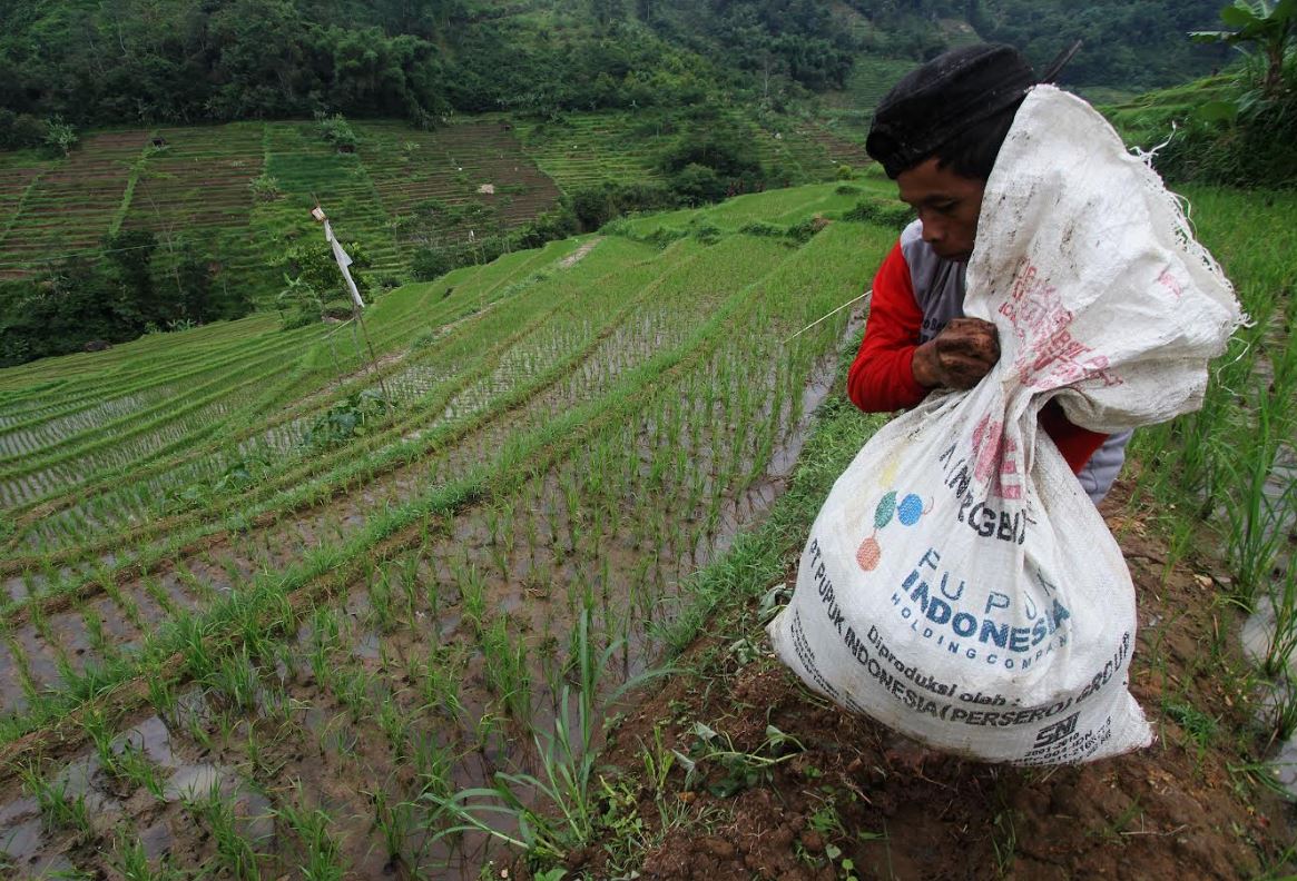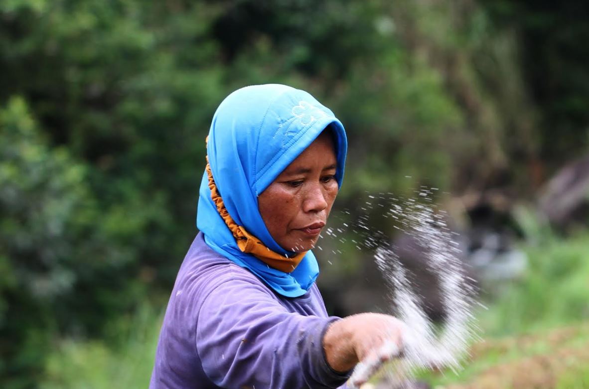Mbah Loso (71) petani di Desa Palang, Kecamatan Matesih, Karanganyar, menaburkan Pupuk Indonesia jenis Urea yang sudah dicampur , Sabtu (26/11/2022). Pupuk Indonesia telah diekspor ke India, Filipina, Autralia, China, Vietnam, Thailand, Meksiko, Jepang, Korea Selatan, Amerika Serikat, serta beberapa negara lainnya | Foto Bram Selo Agung Mardika.