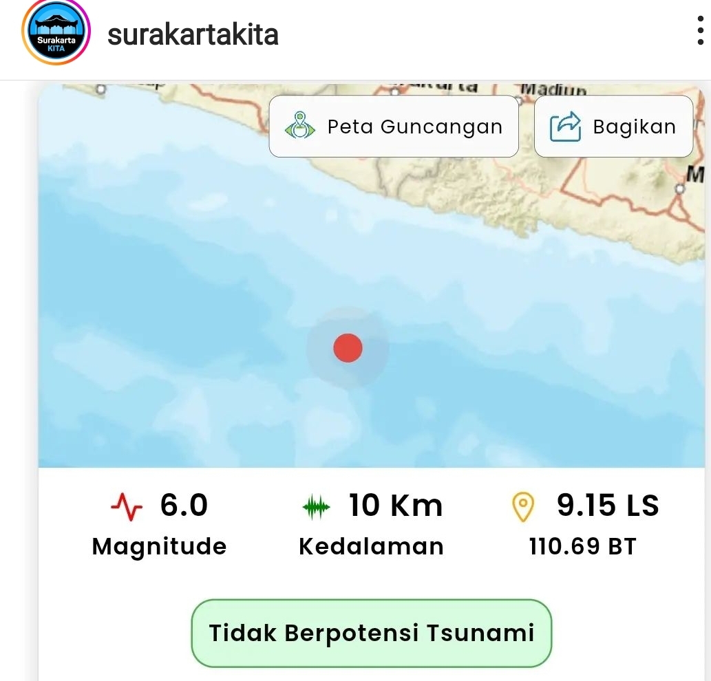 SOLO, MettaNEWS – Gempa bumi berkekuatan 6 SR dengan kedalaman 10 Km berpusat dari Barat Daya Kabupaten Pacitan, Jawa Timur terasa kuat di Solo dan sekitarnya.