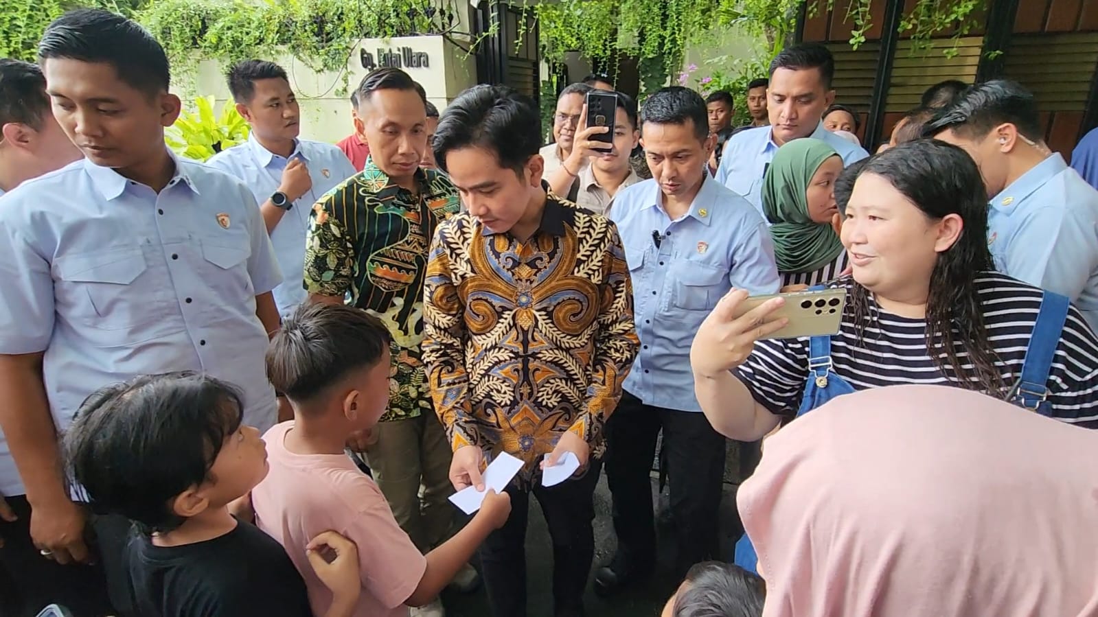 Saat ratusan warga tengah mengantre mendadak keluar Wapres Gibran dari kediaman. Gibran langsung membagikan amplop berisi fitrah kepada anak-anak kecil yang ikut antre.