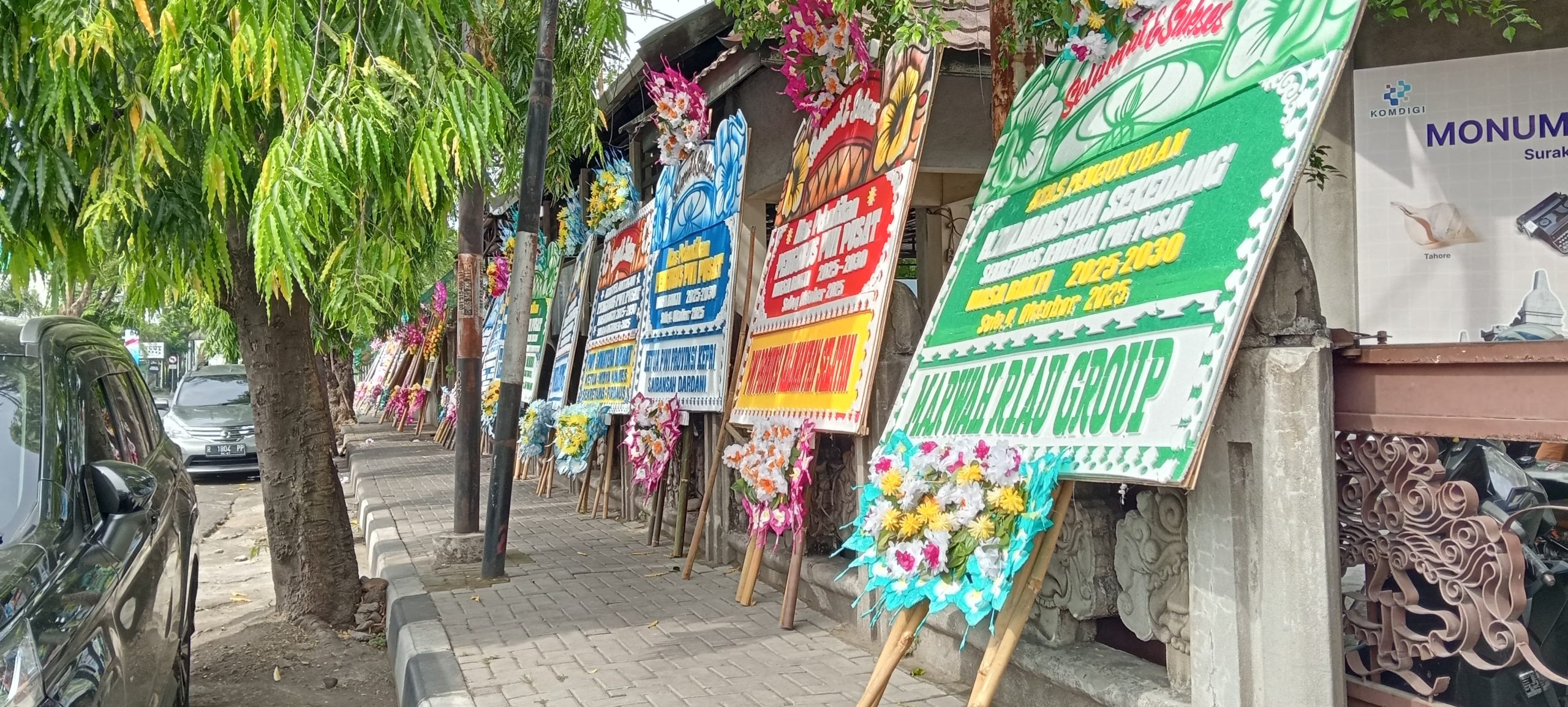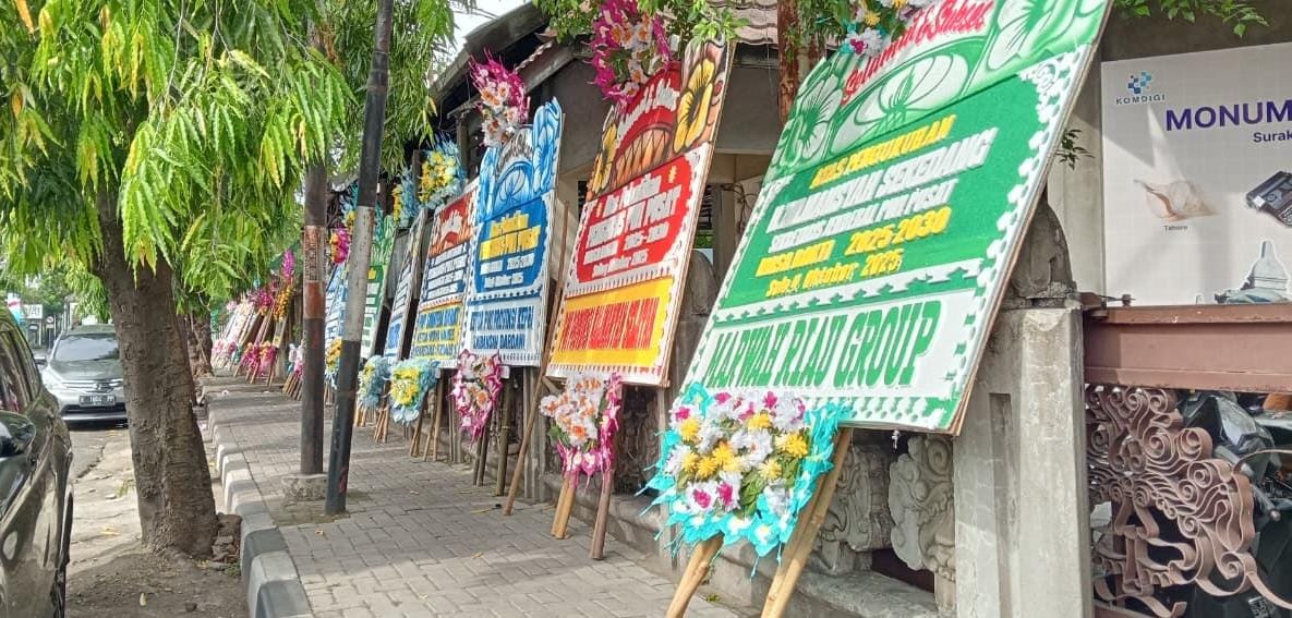 Rangkaian bunga tersebut memenuhi ruas Jalan Gajah Mada dan Jalan Yosodipuro, Banjarsari, menandai antusiasme dan dukungan luas terhadap kepengurusan baru PWI Pusat.