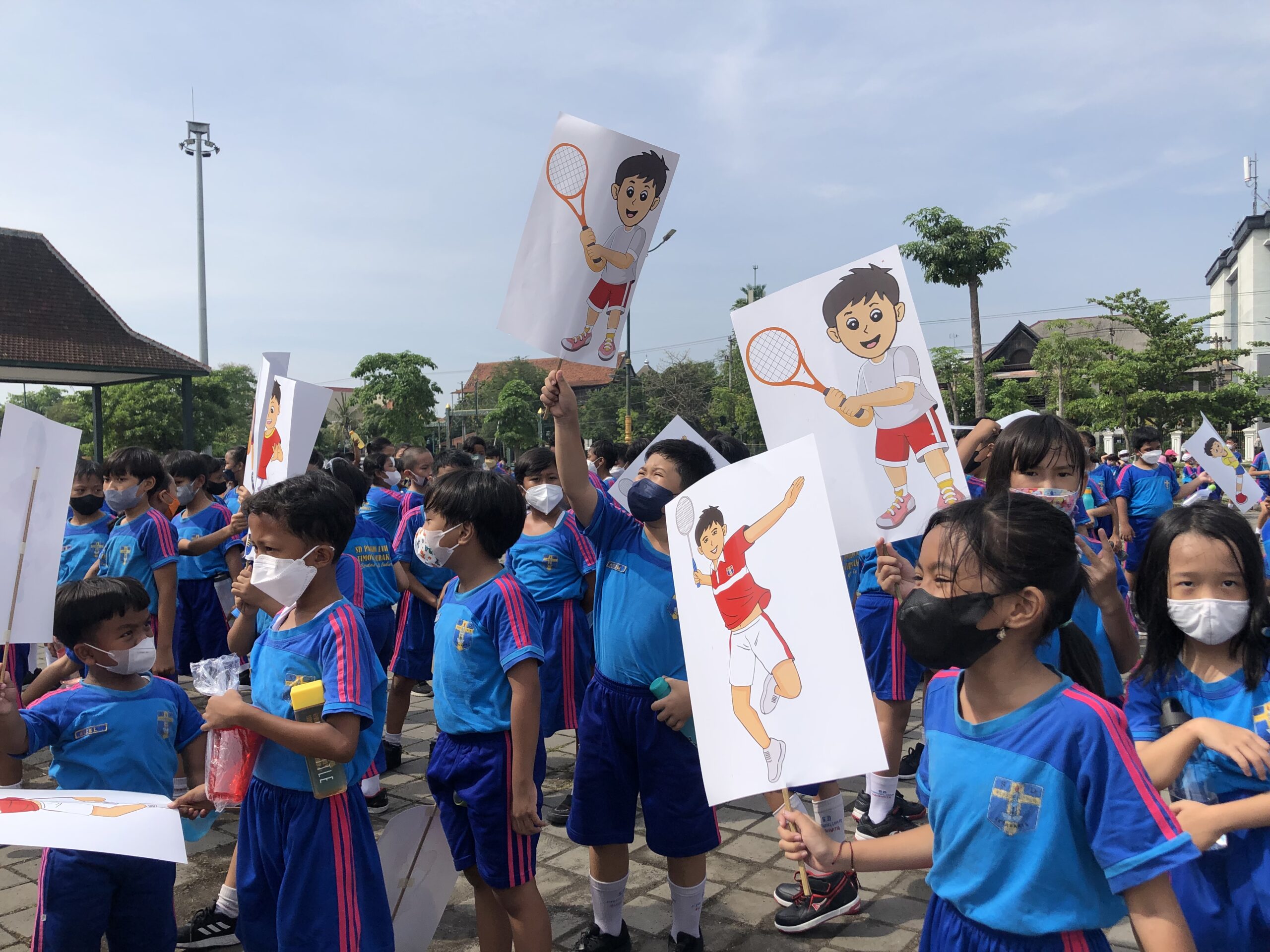 SOLO, MettaNEWS – Ribuan siswa Sekolah Dasar (SD) Pangudi Luhur Solo memperingati Hari Olahraga Nasional (Haornas) 2022 di Pura Mangkunegeran, Jumat (9/9/2022). Bersama guru dan karyawan jalan sehat di mulai dari Jalan Sugiyopranoto nomor 1 dan 5 dengan membawa umbul-umbul serta poster ajakan masyarakat berolahraga.