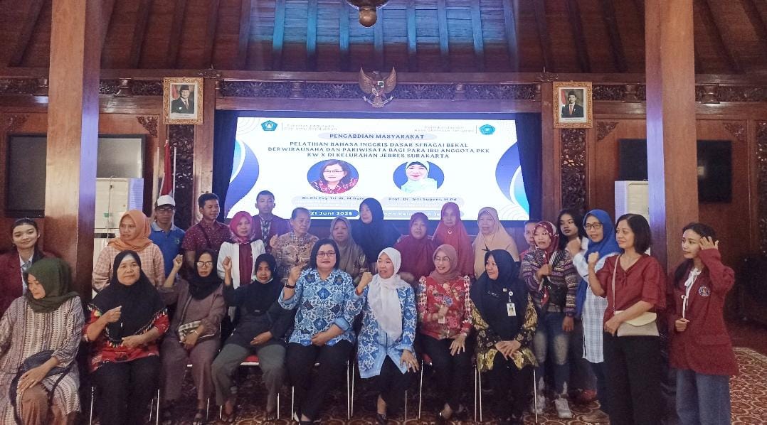 Kegiatan bertema “Pelatihan Bahasa Inggris Dasar sebagai Bekal Berwirausaha dan Pariwisata bagi Para Ibu Anggota PKK RW X di Kelurahan Jebres Surakarta” ini berlangsung pada 20–21 Juni 2025.