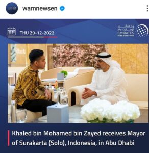 SOLO, MettaNEWS – Wali Kota Solo Gibran Rakabuming tengah berada di Uni Emirat Arab untuk mengunjungi Pangeran Sheikh Khaled bin Mohamed bin