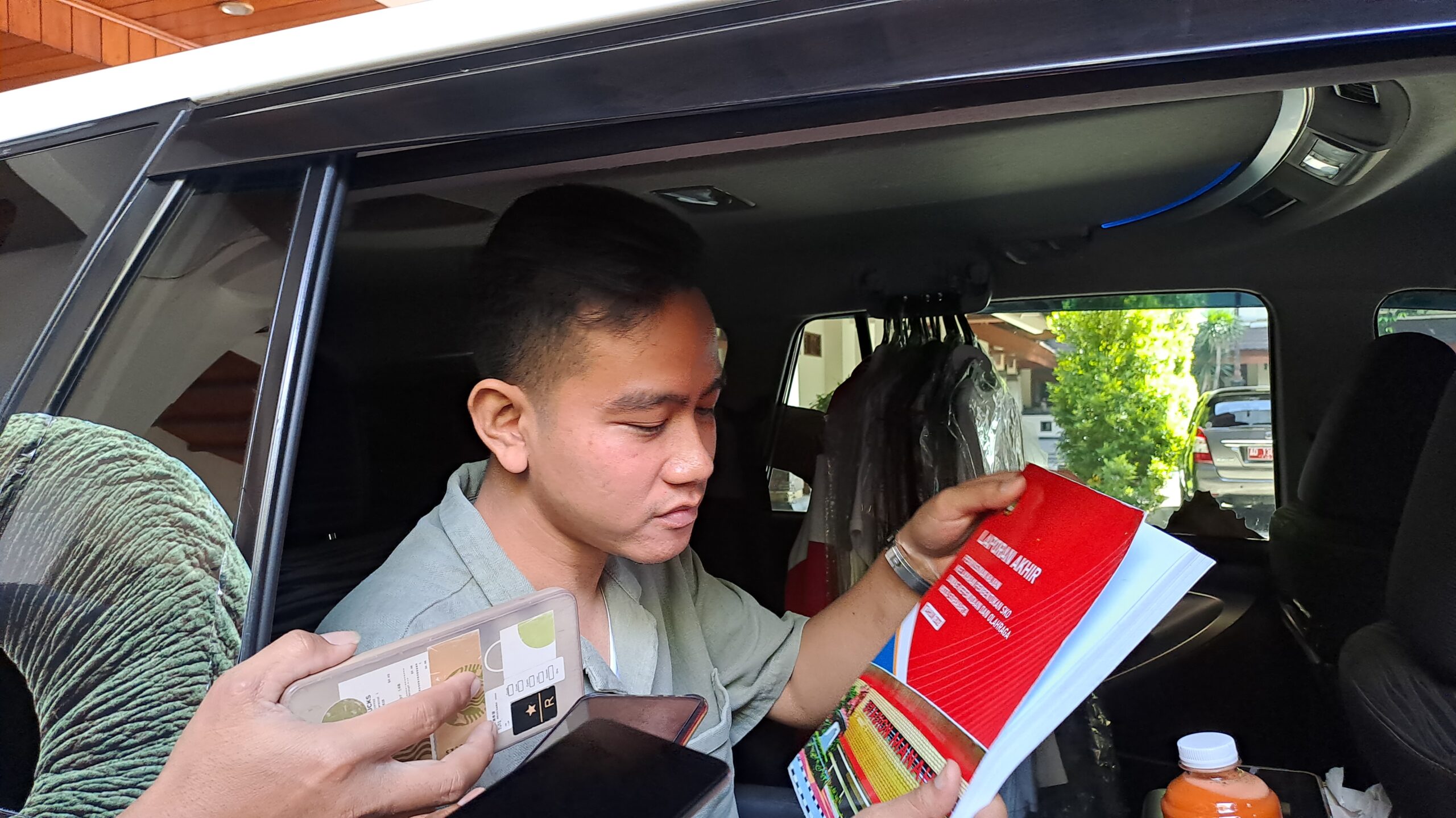 Terkait Kaesang yang mengenakan kaus bergambar Prabowo, Gibran mempersilahkan wartawan untuk bertanya langsung ke Kaeaang.