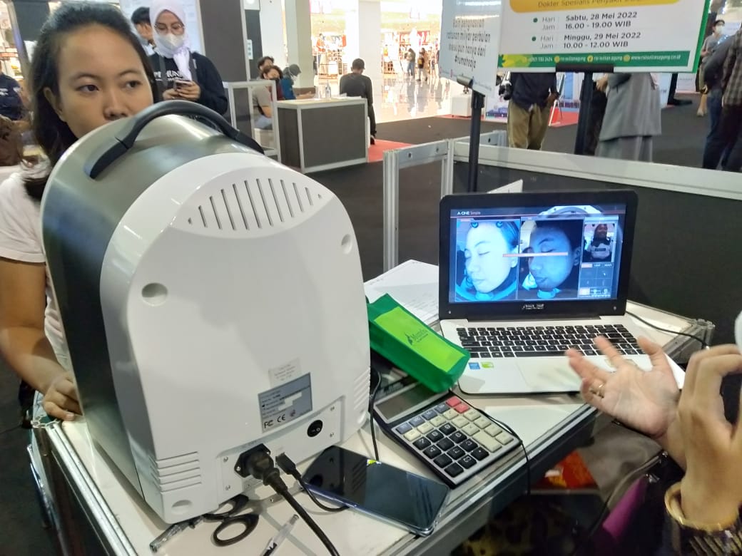Pengunjung Indonesia Wellness & Health Tourism Expo 2022 mencoba tes kesehatan kulit gratis di stand Munkos, Sabtu (28/5/2022) | Metta NEWS / Puspita