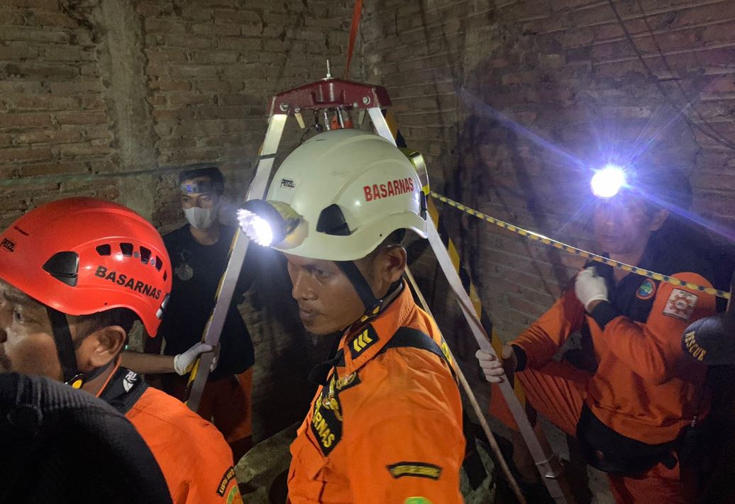 Setelah itu, seorang rescuer dengan tabung pernapasan SCBA (Self Contained Breathing Apparatus) dikerek turun ke dalam sumur. Setelah berhasil mengikat tubuh korban, kemudian ditarik ke atas.