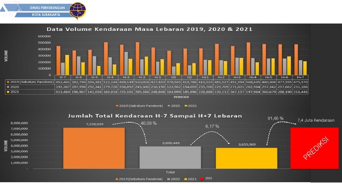 SOLO, MettaNEWS – Dinas perhubungan (Dishub) kota Solo memprediksi volume kendaraan masa pada saat arus mudik Lebaran 2022 naik hingga 91,46 persen dengan jumlah 7,4 juta kendaraan, dibandingkan dengan Hari Raya Idul Fitri saat pandemi Covid-19.