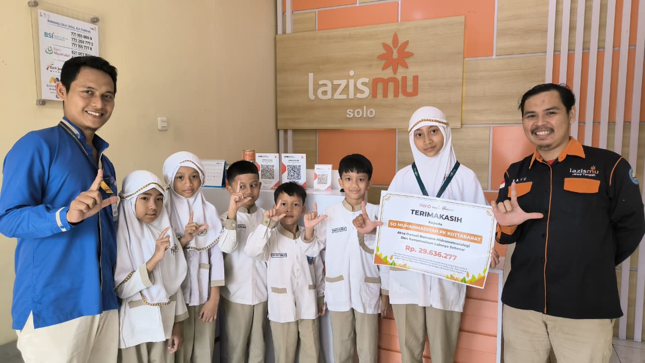 SOLO, MettaNEWS – Sebanyak enam murid SD Muhammadiyah Program Khusus (PK) Kottabarat Solo mewakili sekolah mereka untuk menyerahkan donasi peduli bencana alam ke Kantor LAZISMU Solo, Rabu (10/12/2025). Kegiatan ini digelar di Jl. Popda, Nusukan, Kecamatan Banjarsari.