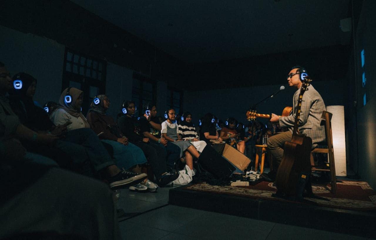“Karena aku merasa musik-musik yang aku mainkan tuh rasanya personal ya, akustik gitar dengan vokal, dan kalau kita pakai headphone tuh akan tambah sempurna sih,” terang Adhitia Sofyan mengenai pemilihan konsep silent gig dalam tur ini.