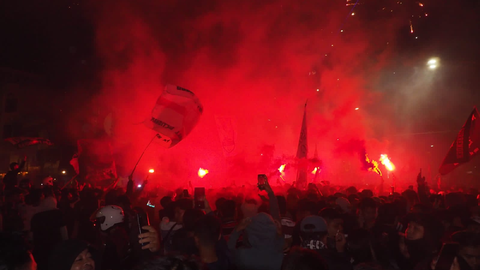 Anthem Persis Solo “Satu Jiwa” menggema di sepanjang Jalan Slamet Riyadi. Langit malam Kota Solo kemudian berubah menjadi terang oleh nyala flare dan kembang api yang silih berganti dalam beberapa menit. Suasana kota berubah bak pergantian tahun baru.