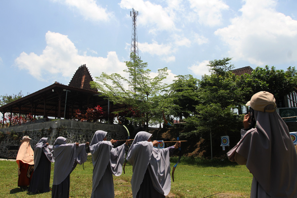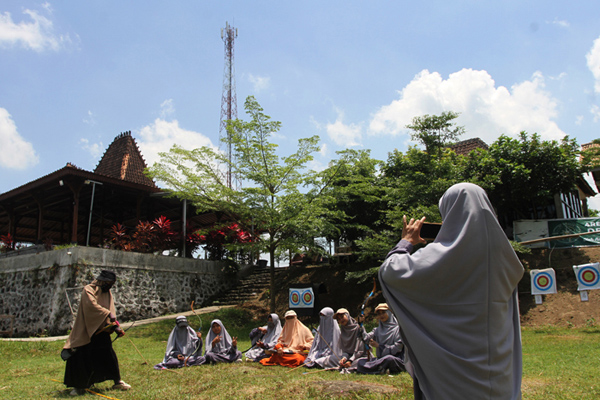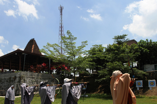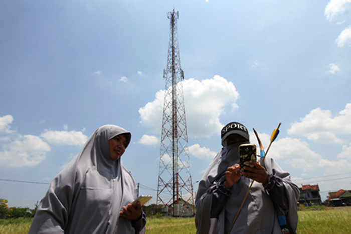 Dua warga usai berlatih panahan untuk persiapan kompetisi, memakai gawai untuk berkomunikasi di depan menara (tower) telekomunikasi milik PT Tower Bersama Infrastructure Tbk (TBIG) di Desa Wangen, Kecamatan Polanharjo, Kabupaten Klaten, Jawa Tengah (20/9/2025). TBIG yang mengelola 42.663 penyewaan dan 24.056 lokasi menara telekomunikasi mencatat pendapatan Rp3,45 triliun pada Januariâ??Juni 2025 naik 1,06 persen dibanding periode yang sama tahun sebelumnya Rp3,41 triliun sebagai bagian dari dukungan percepatan pertumbuhan ekonomi Indonesia.