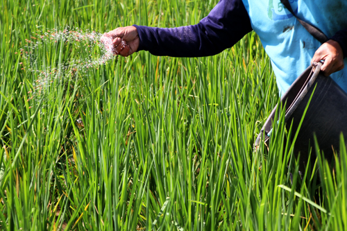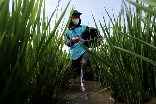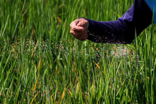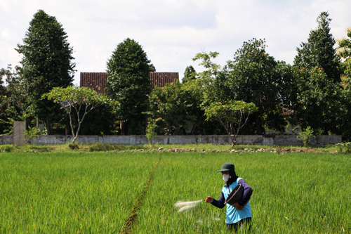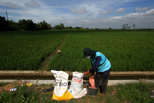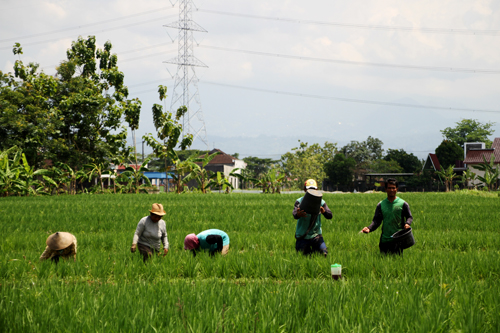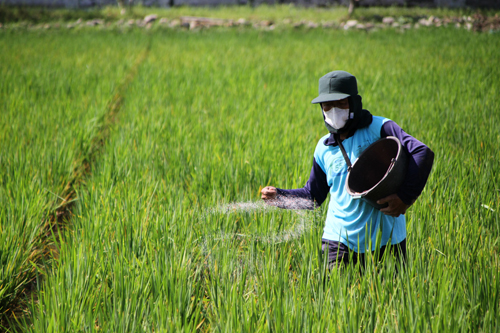 SUKOHARJO, MettaNEWS – Sayuti (63) mengibaskan topinya seakan panas tidak membuat semangatnya pudar untuk memberi pupuk ke tanaman padi miliknya yang berumur sekitar 25 hari. Ini sudah saya taburi pupuk dua kali mas, karena kualitas tanamannya agak kurang, daun padinya menguning, padahal kalau kualitasnya bagus daun padinya akan tumbuh merata dan berwarna hijau.