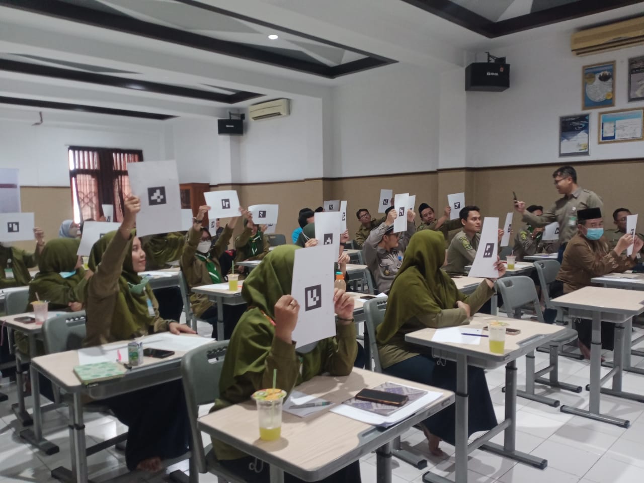 Untuk memberikan jawaban, guru cukup mengangkat barcode pada kertas sesuai dengan pilihan jawabannya. Petugas kemudian melakukan scand pada barcode tersebut. Sebelumnya panitia sudah membagikan barcode kepada semua guru.