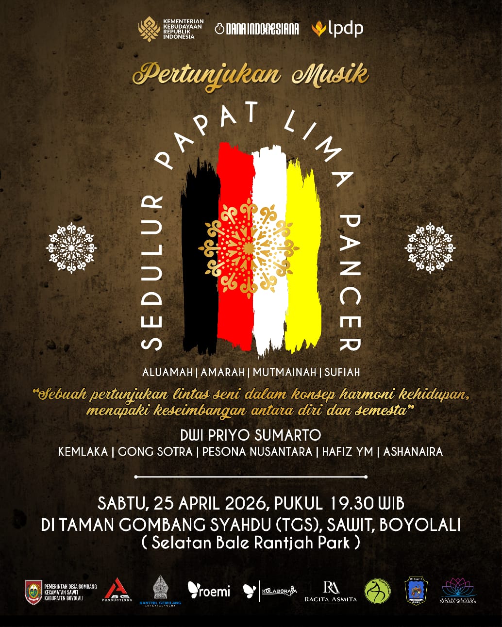 BOYOLALI, MettaNEWS — Pertunjukan musik bertajuk Sedulur Papat Limo Pancer akan digelar pada Sabtu, 25 April 2026 mulai pukul 19.30 WIB di Taman Gombang Syahdu (TGS), Sawit, Boyolali.