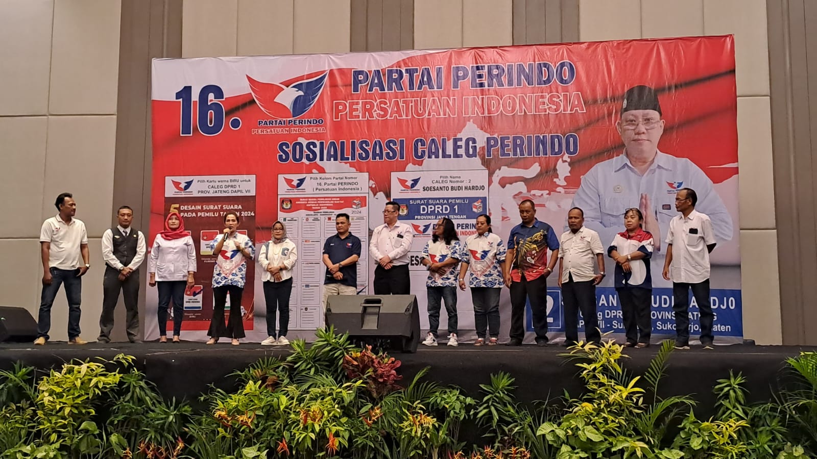 Pada sosialisasi Soesanto sebagai caleg DPRD Provinsi Jateng Dapil 7 di Hotel Grand Mercure Solo Baru, Jumat (2/2/2024), hadir Ketua DPD Perindo Solo Milia Jatmiati, Ketua DPD Perindo Sukoharjo Nugroho Iman Santosa beserta semua caleg Perindo Dapil 5 dan 7.