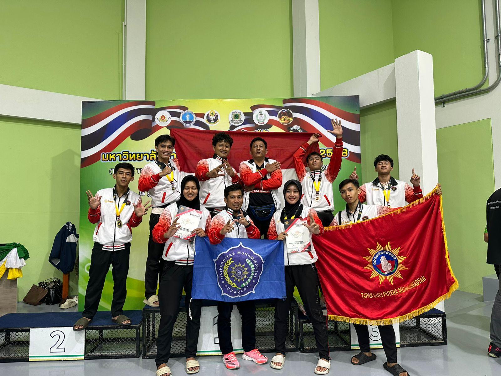 SOLO, MettaNEWS — Tim Tapak Suci Universitas Muhammadiyah Surakarta (UMS) kembali menorehkan prestasi membanggakan di tingkat internasional. Dalam ajang ASEAN University Pencak Silat Championship 2025 yang digelar di Thailand National Sport University pada 24–27 Juni 2025, tim ini berhasil memborong tujuh medali, terdiri dari empat emas, satu perak, dan dua perunggu.