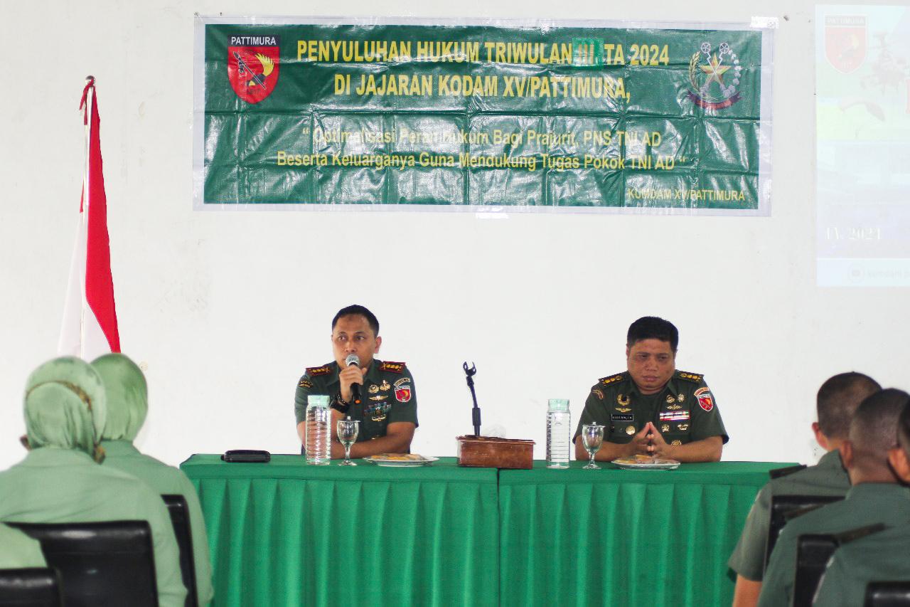 Materi penyuluhan disampaikan oleh Waka Kumdam XV/Pattimura, Letkol Chk Yulius Dedi Wijayanto, S.H. Yang menekankan bahwa peningkatan kesadaran hukum merupakan salah satu upaya untuk mencegah pelanggaran hukum di lingkungan Militer.