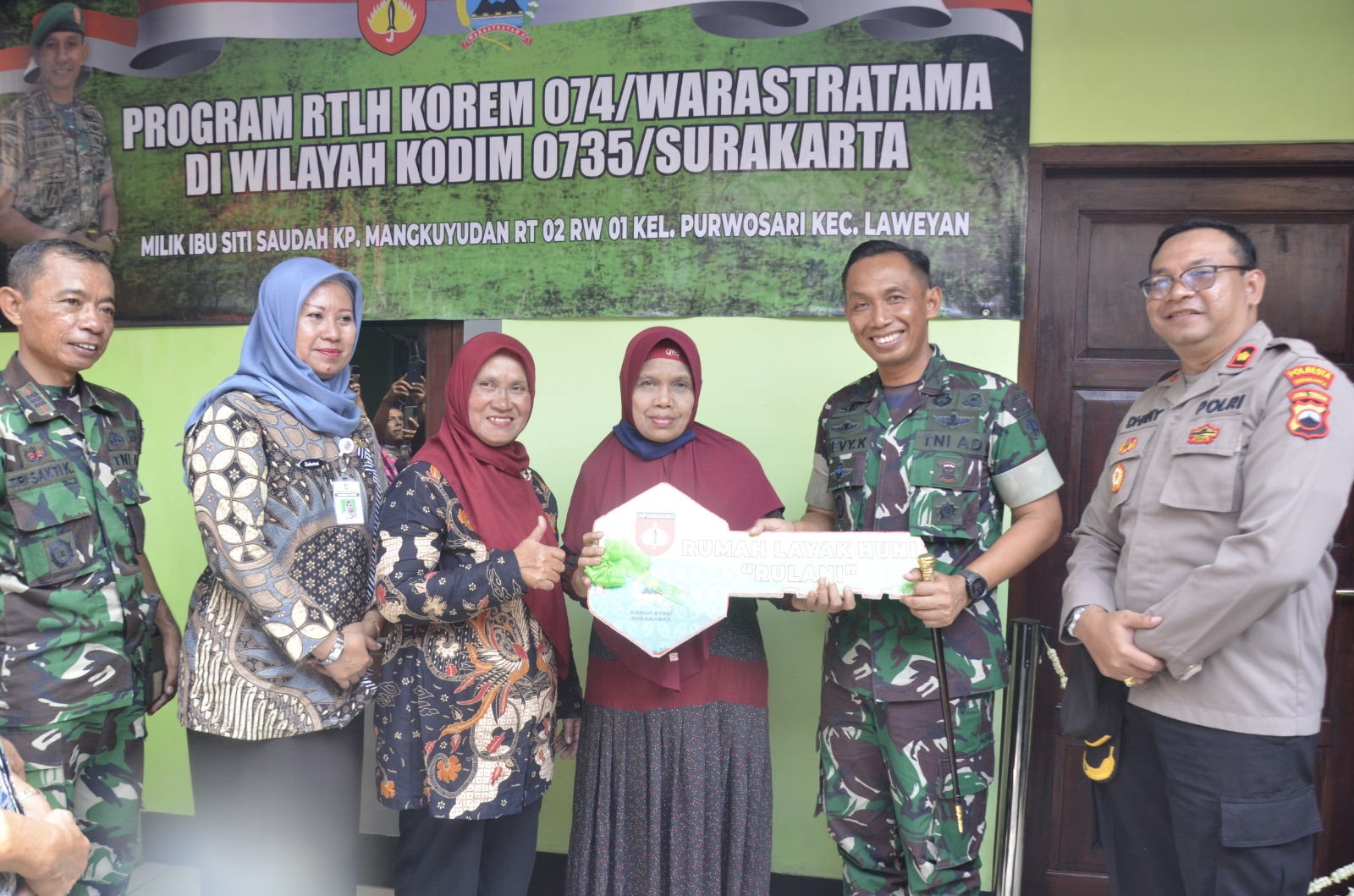 Korem 074/Warastratama melaksanakan bedah rumah di rumah milik Ibu Siti Saudah, seorang janda berusia 64 tahun di Kp. Mangkuyudan RT 02, RW 01, Purwosari, Laweyan yang merupakan wilayah Kodim 0735/Surakarta.