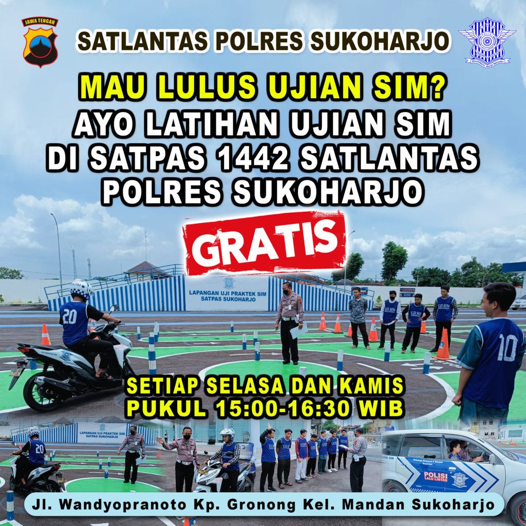 Bimbingan belajar teori dan praktik gratis ini diadakan di Satpas SIM Polres Sukoharjo setiap hari Selasa dan Kamis, dimulai pukul 15.00 WIB sampai dengan 16.30 WIB.