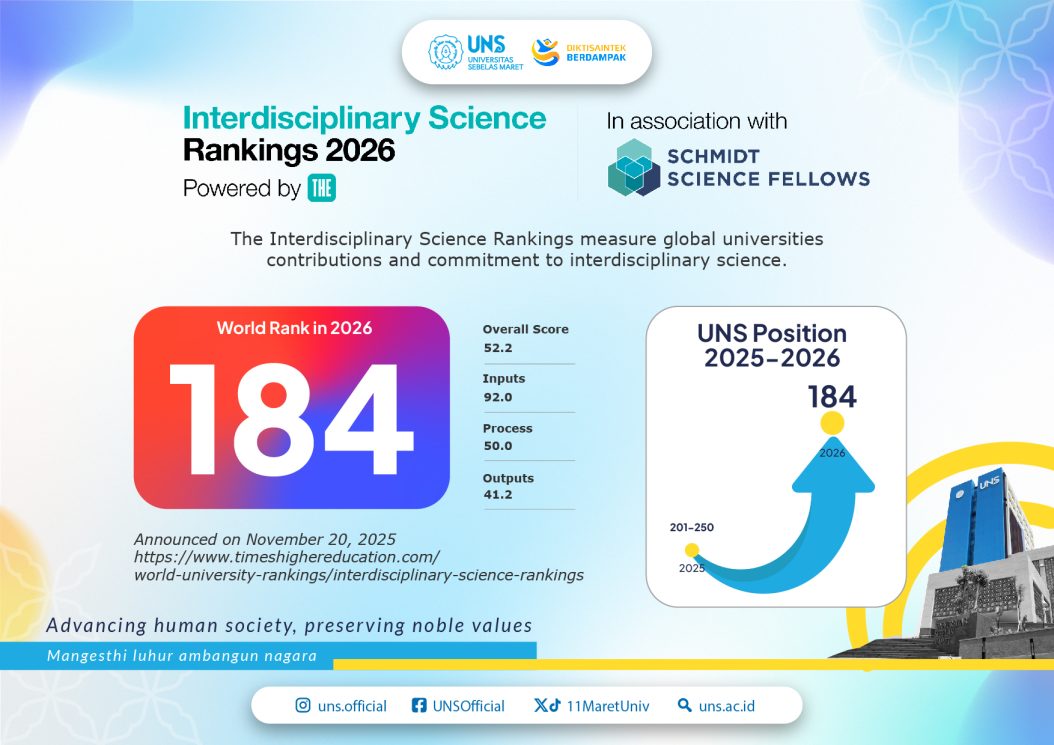Peringkat global ini diharapkan menjadi penguat bagi UNS untuk terus memperluas kolaborasi riset, meningkatkan publikasi internasional, dan memperkokoh posisi Indonesia di peta persaingan pendidikan tinggi dunia.
