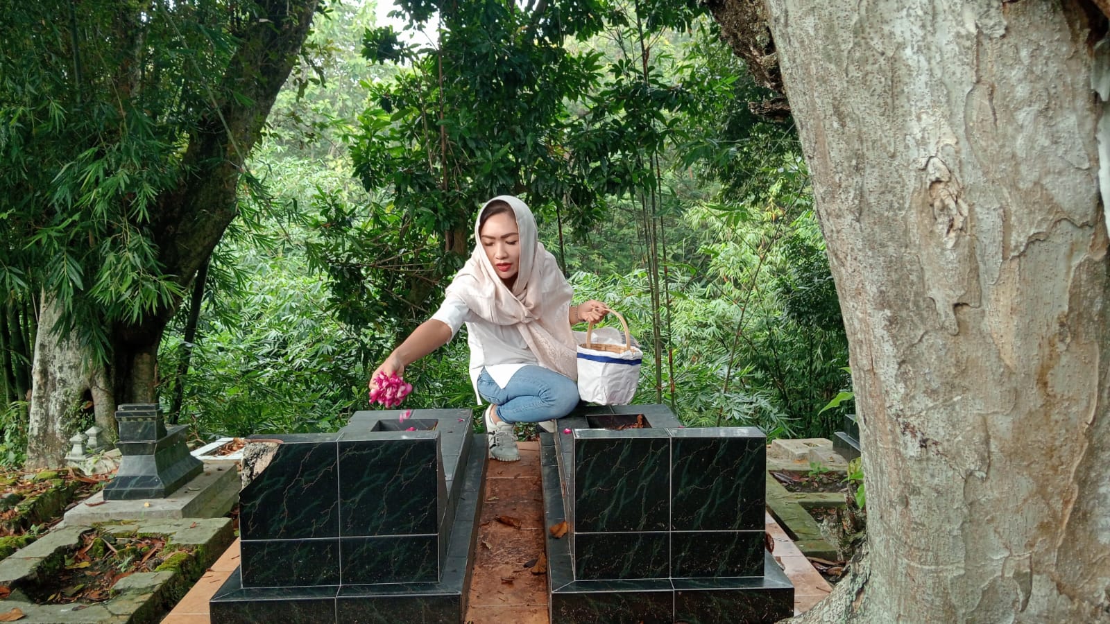 “Mbah Waginem, mbahku tersayang. Ini ibu kandung dari ayah saya dan yang paling memotivasi saya. Beliau single parents, tidak bisa baca tulis namun sangat gigih hingga akhirnya berhasil sukses dengan bisnis sendiri dan bisa naik haji. Kegigihan tersebutlah yang ingin saya contoh,” ucapnya sambil tersenyum dan menaburkan bunga di atasnya.