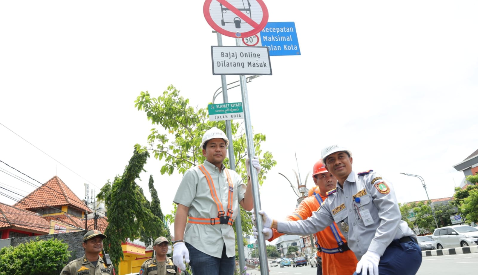 Rambu bertuliskan “Bajaj Online Dilarang Masuk” tersebut dipasang bersama Kepala Dinas Perhubungan (Dishub) Solo Taufiq Muhammad serta pejabat utama Dishub.