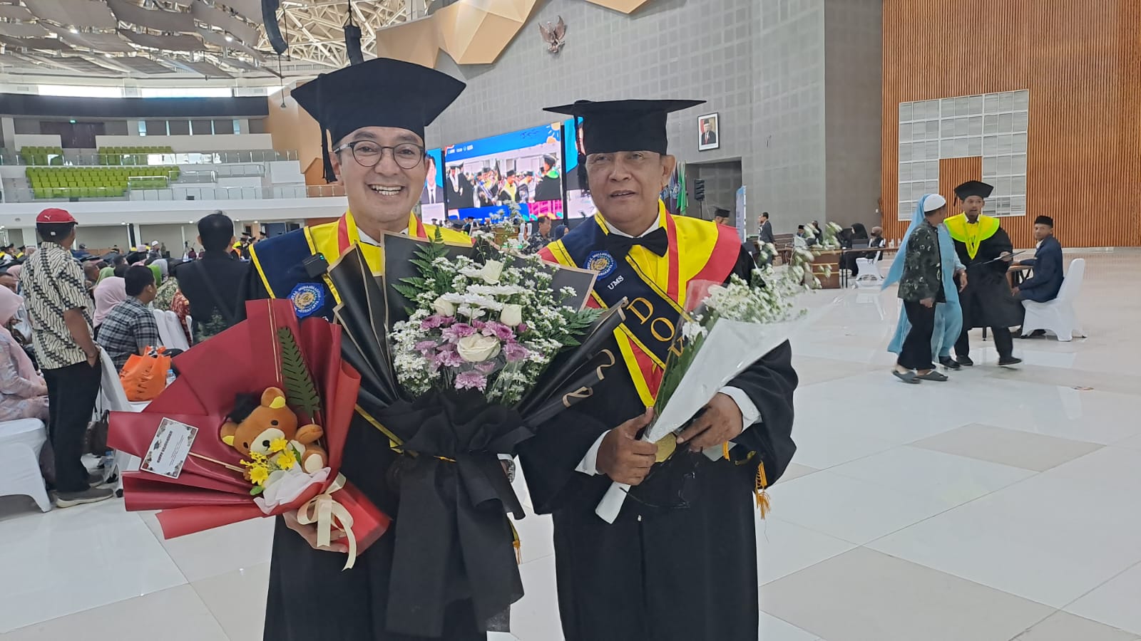 Selain Bambang Yugo, Kepala Biro Humas UMS Budi Santosa juga mengikuti wisuda doktoral.